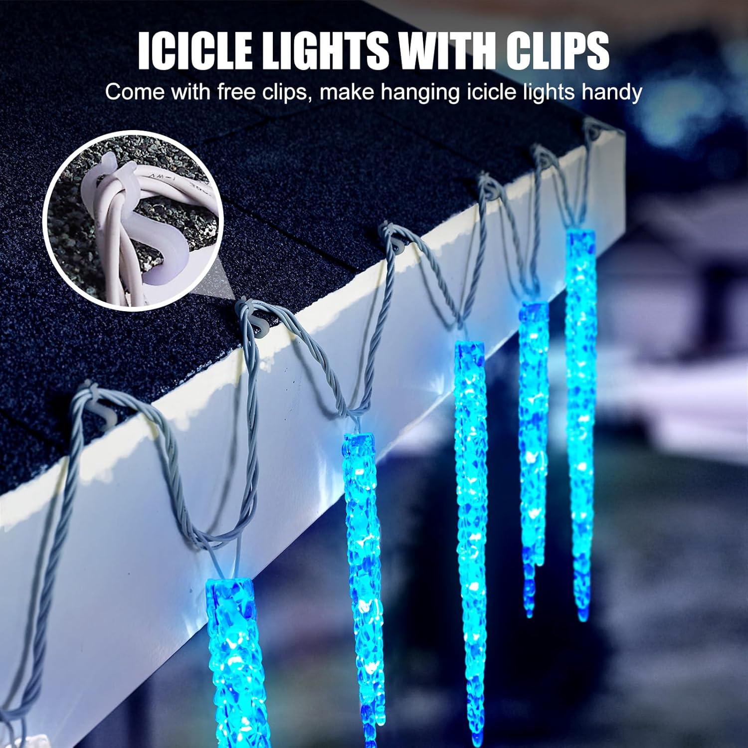 - 【Waterproof Ice Cycle Lights】These outdoor icicle Christmas lights are IP44 waterproof and easy to install with grippers, cable ties, or hooks; Hanging them in your living room, on your windows, or throughout your yard to add a magical snowy touch to your holiday decor;