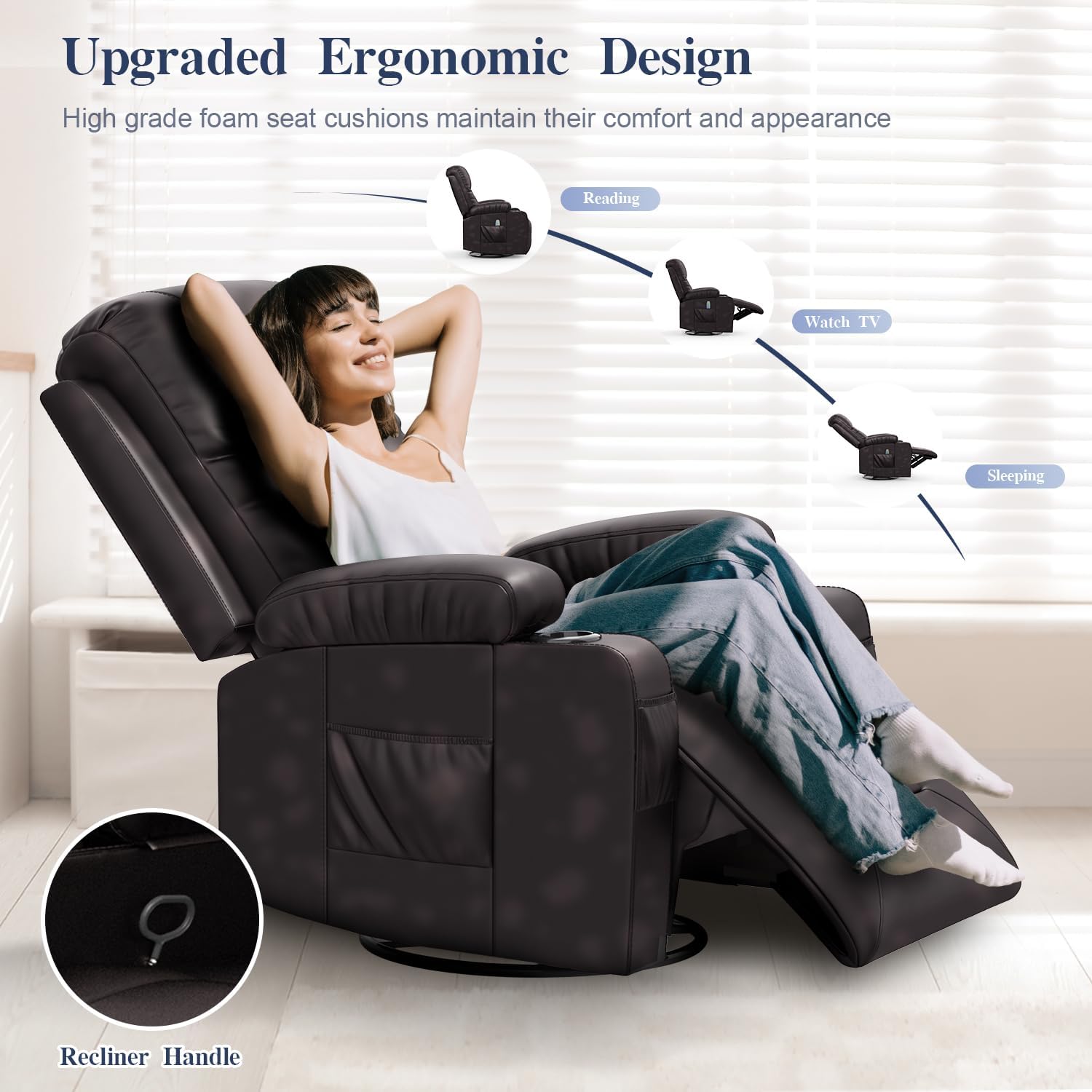 - 【Important notice】The footrest of this swivel recliner is not electrically unfolded but unfolded by the side pull ring, closing the footrest will encounter some resistance, so it is not recommended for post-surgical recovery use.