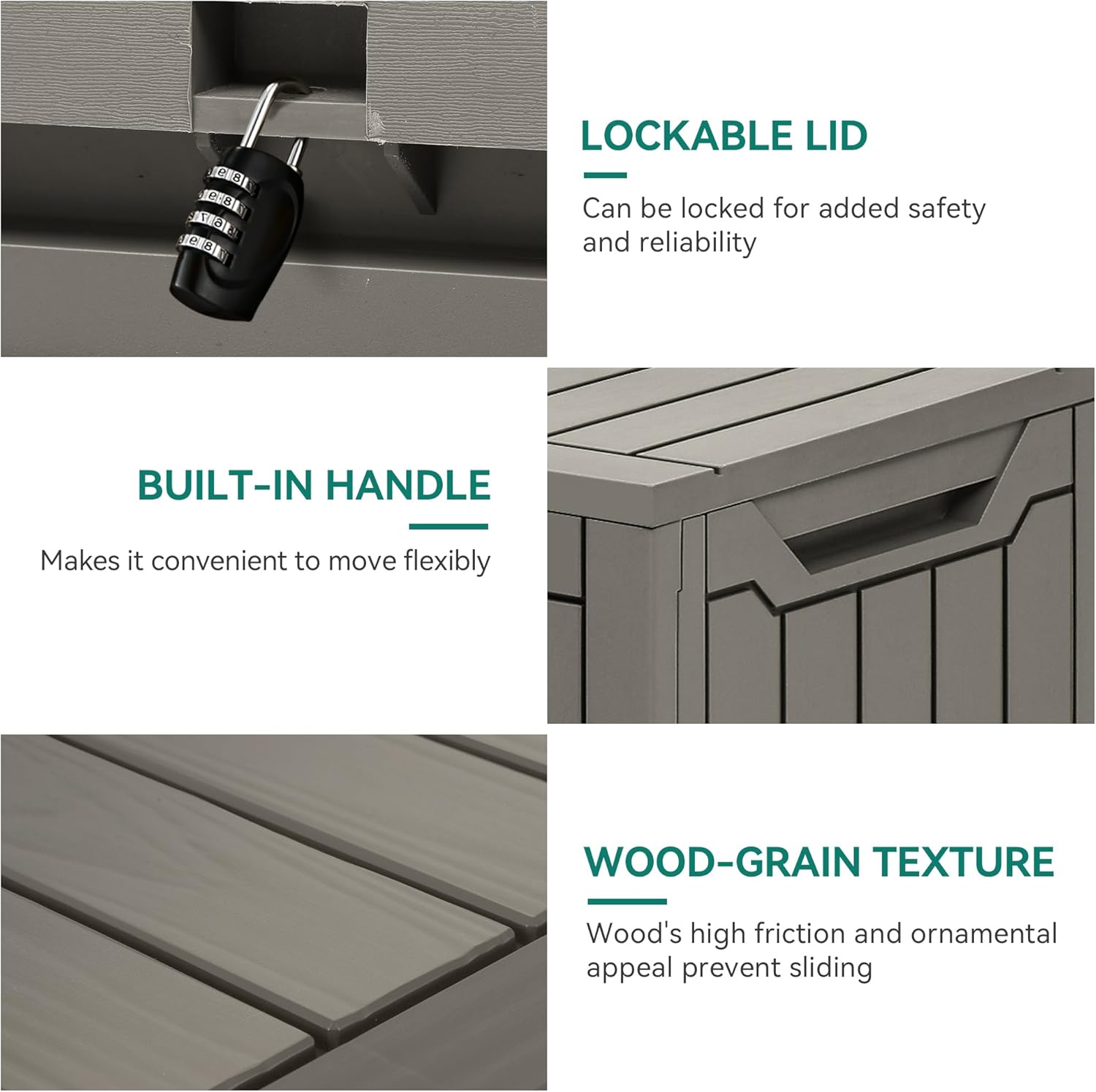 - Versatile Garden Storage: This resin deck box serves as an additional table or bench that can accommodate two adults weighing up to 300 pounds total; It seamlessly blends into any yard or patio, and conveniently stores outdoor patio furniture cushions, tools, rain gear, and pool supplies