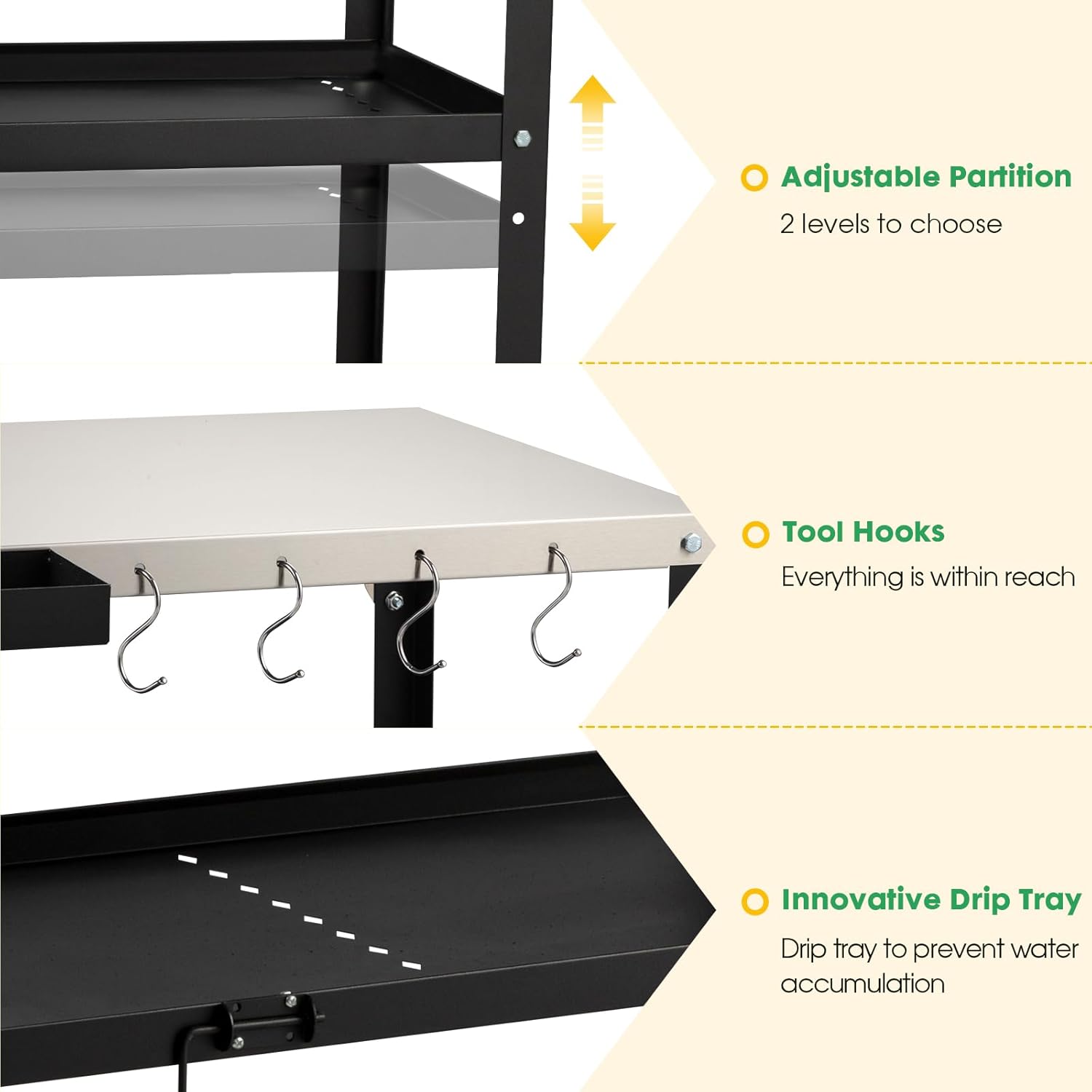 - STAINLESS STEEL COUNTERTOPS: Outdoor barbecue countertops are designed with embroiderless steel metal to provide enough work space for outdoor cooking, kitchen or service areas and are durable. And the spacious desktop is rust-proof.