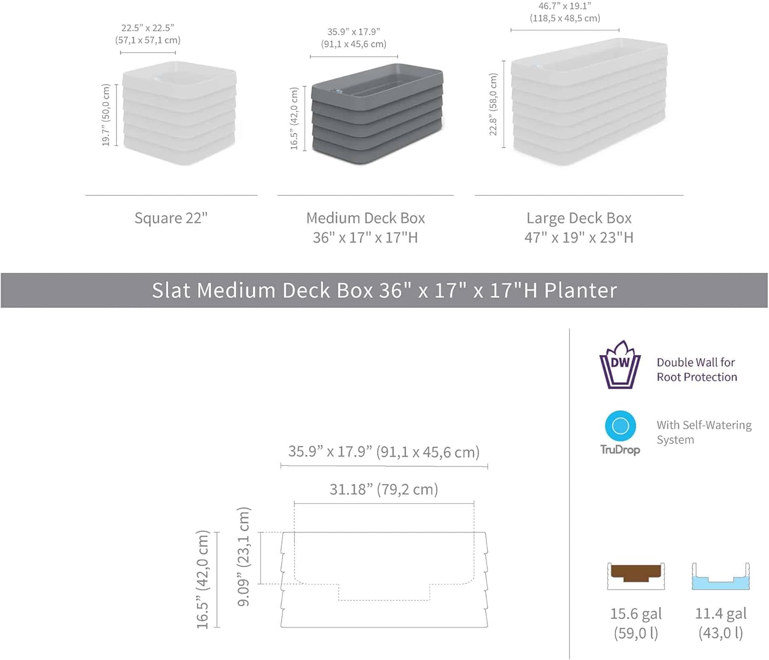 Crescent Garden TruDrop Self Watering Slat Medium Rectangular Planter Box for All-Weather - Outdoor Deck Box Planter for Flowers and Herbs, 36'' x 17'' x 17''H (Slate)