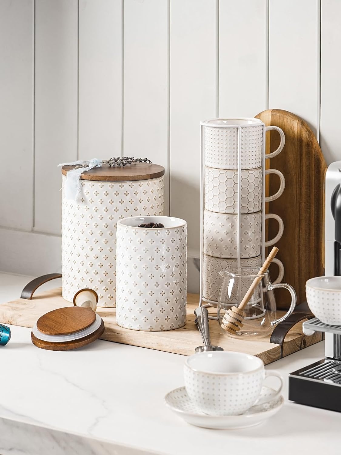 - Embossed Design: Featuring an arctic white glaze with a charming embossed pattern, these farmhouse-style ceramic jars will add warmth and vitality to your home. Their elegant design complements various home styles, making them the perfect addition to your countertop or coffee corner. Enhance your home’s aesthetics and let these jars become a standout decorative element in your living space