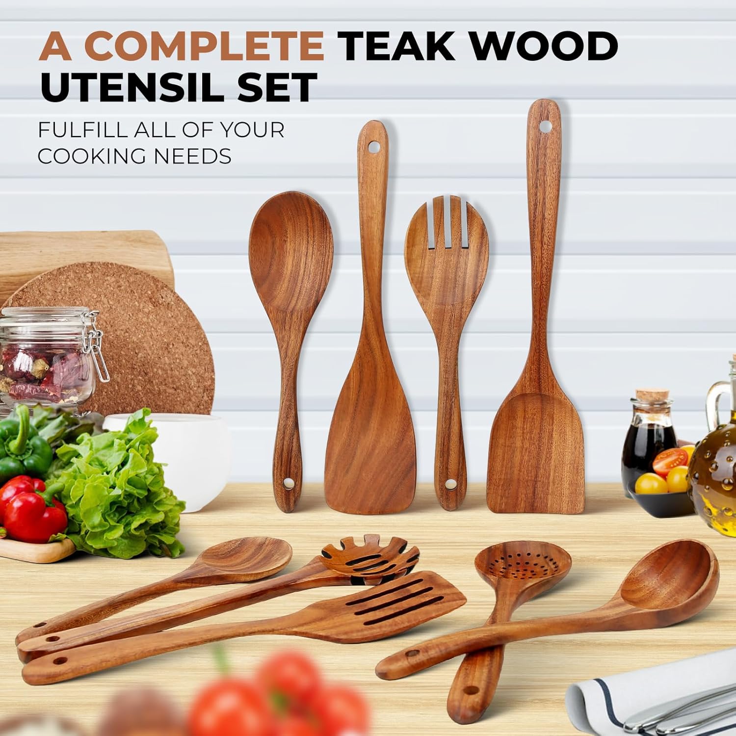 - 【Suitable for Non-stick Pans】Our teak wood utensil sets are perfect for nonstick cookware, preventing scratches and damage. These kitchen necessities are strong, long-lasting, scent-free, heat-resistant, and designed for everyday cooking, making them ideal for high-temperature cooking