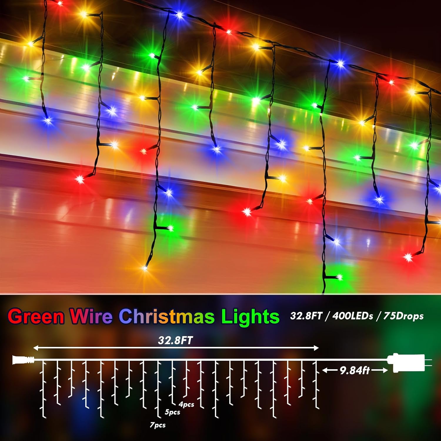 KNONEW 33FT 400 LED Christmas Lights Outdoor Black Wire String Lights with 75 Drops, 8 Lighting Modes, Timer Memory Function Connectable Hanging Curtain Lights for Halloween Party Decor(Multicolor)