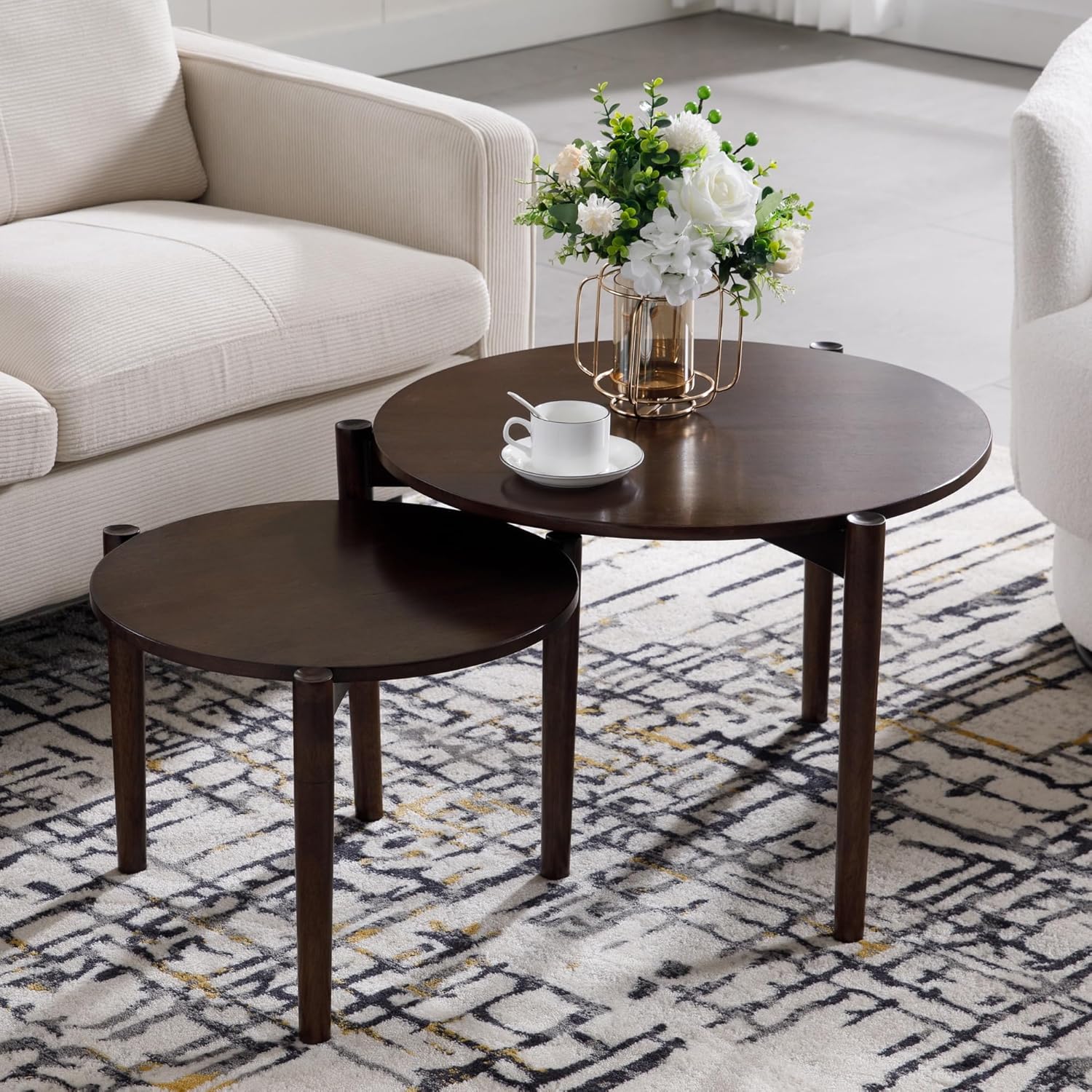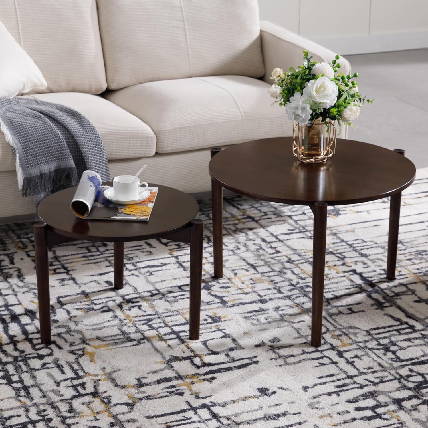 Wooden Round Modern Nesting Coffee Set of 2, Round End Table Side Table, Stacking Living Room Accent Tables for for Living Room Bedroom Balcony, Walnut