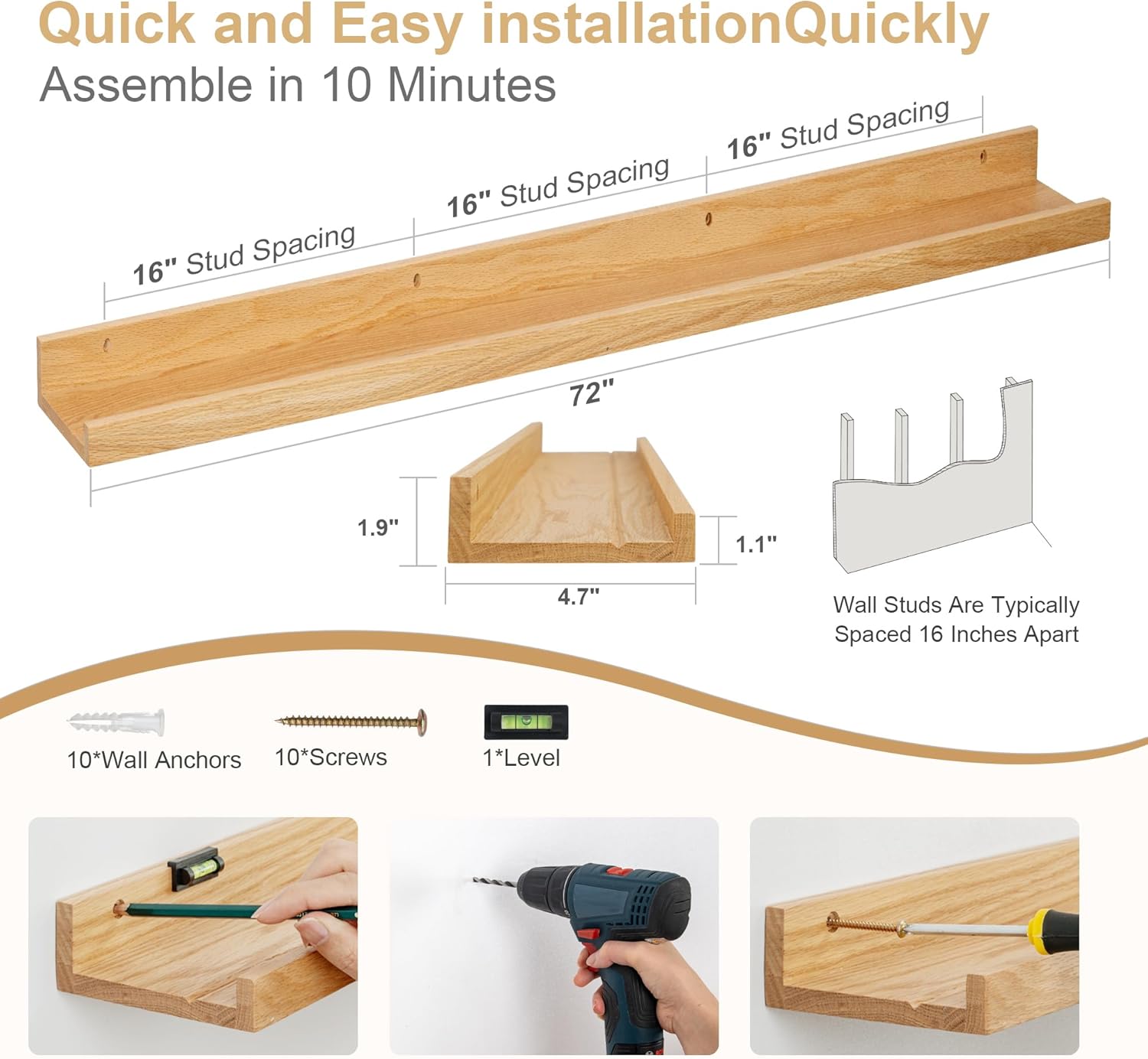 - Picture Ledge Design: Ideal for displaying photos, artwork, small plants, or collectibles, these shelves feature a thoughtful ledge design with a subtle lip and a shallow groove behind it. This design securely holds items in place while maintaining a clean, modern look.