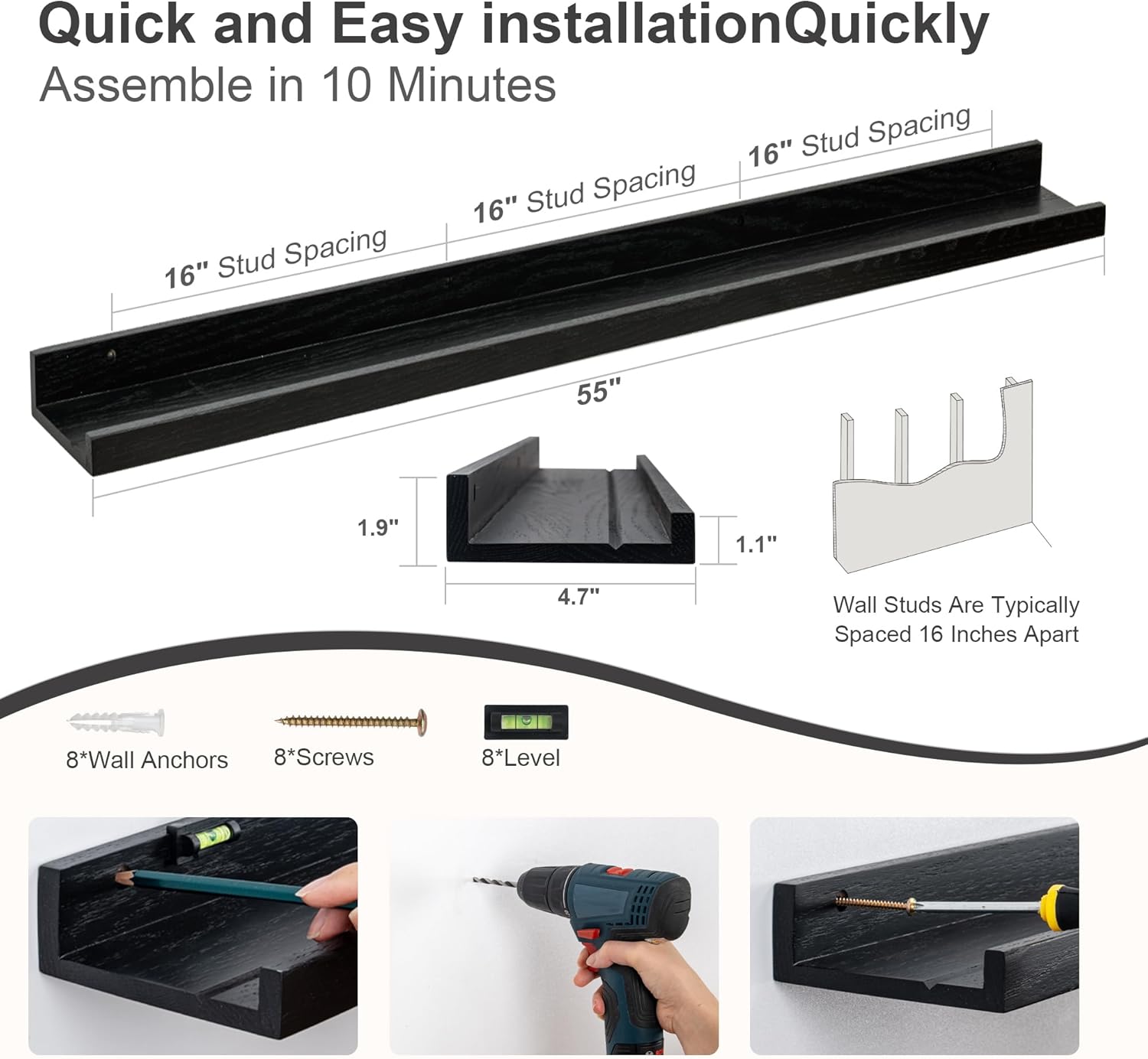Floating Picture Ledge Shelves 55 Inch Solid Oak Wood Set of 2, Rustic Wall Storage Shelves with Lip, Kids Bookshelf, Photo & Picture Ledge Shelves for Bedroom, Living Room, Kitchen