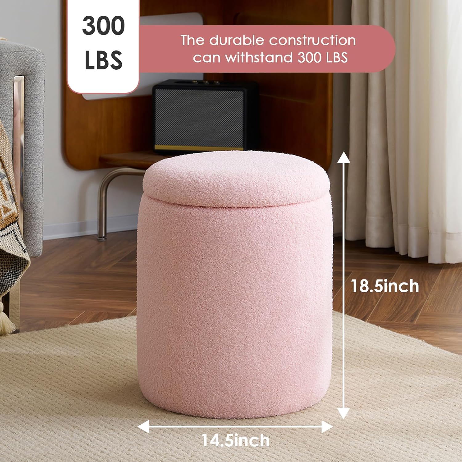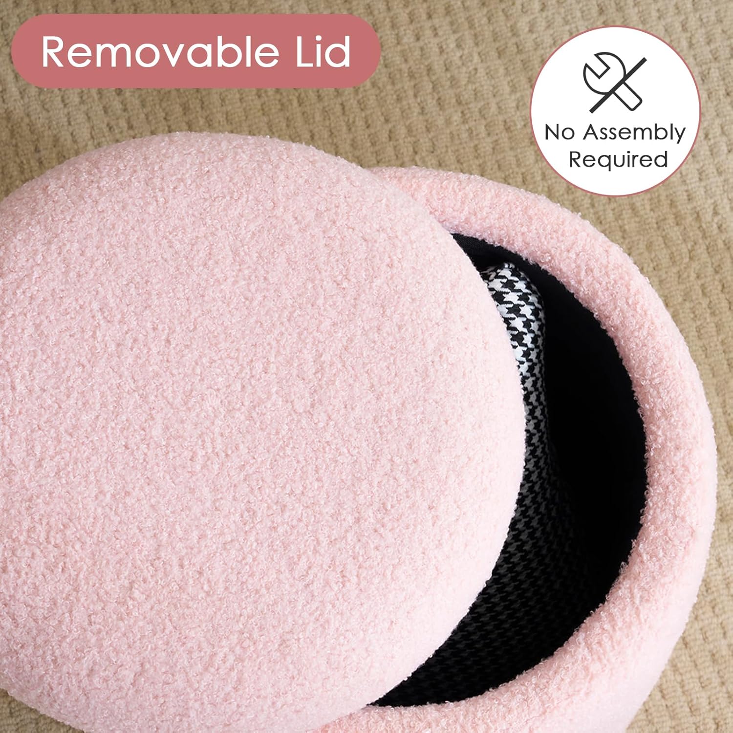 YFO Round Ottoman with Removable Lid Upholstered, Multifunctional Vanity Chairs for Makeup, Soft Footrest Stool Ottoman Foot Stool for Living Room, Bedroom, Boucle, Pink