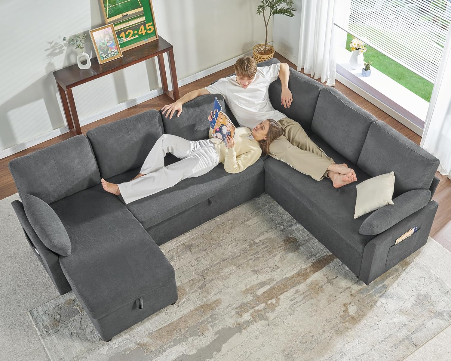 VanAcc Pull Out Sofa, 112 Inch Oversized U Shape Sleeper Sofa Couch with Storage Chaise & 3 Seater, Comfy Couch with Pull Out Bed for Living Room, Grey Linen