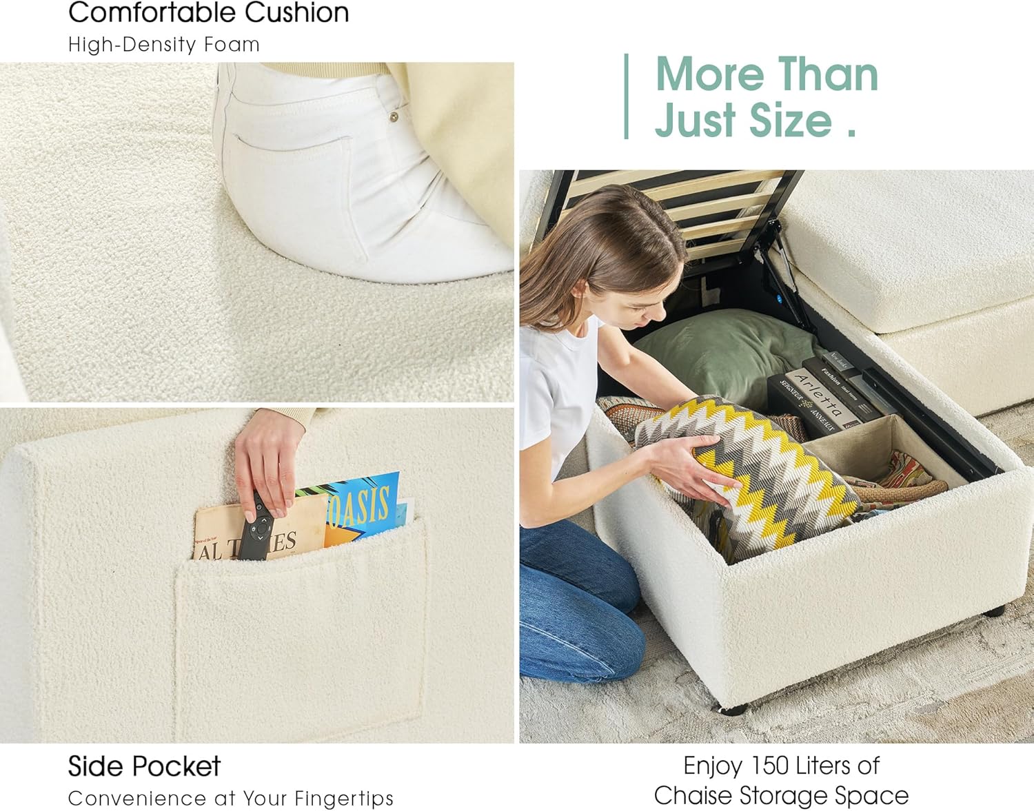 VanAcc Pull Out Sofa, 112 Inch Oversized U Shape Sleeper Sofa Couch with Storage Chaise & 3 Seater, Comfy Couch with Pull Out Bed for Living Room, White Boucle