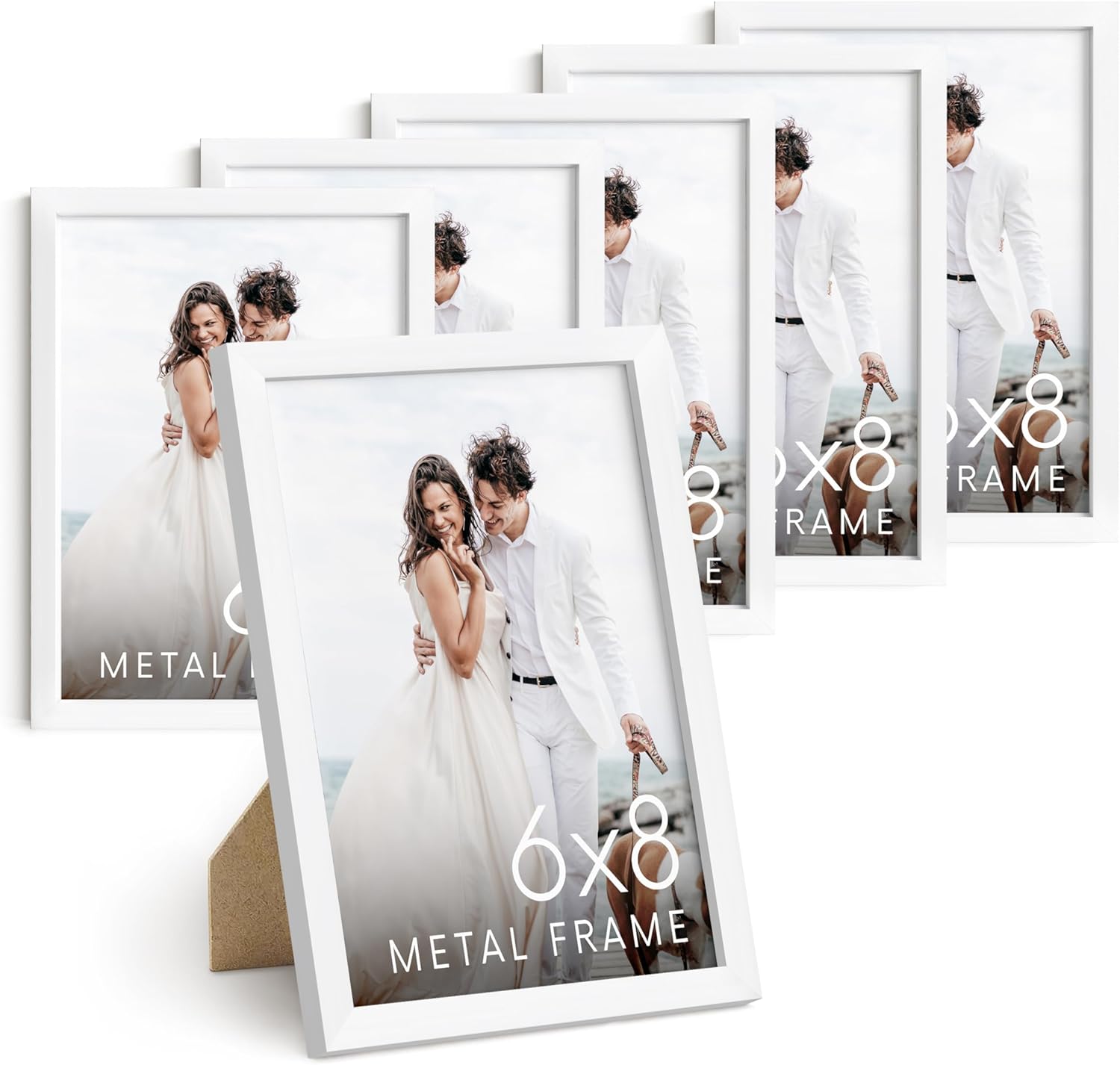 HAUS AND HUES 6x8 White Metal Picture Frames - Photo Frames 6x8 - Features Premium Aluminum, Vertical Hanging, Easel Back for Tabletop, Home, Office (6x8 in, White, Set of 6)