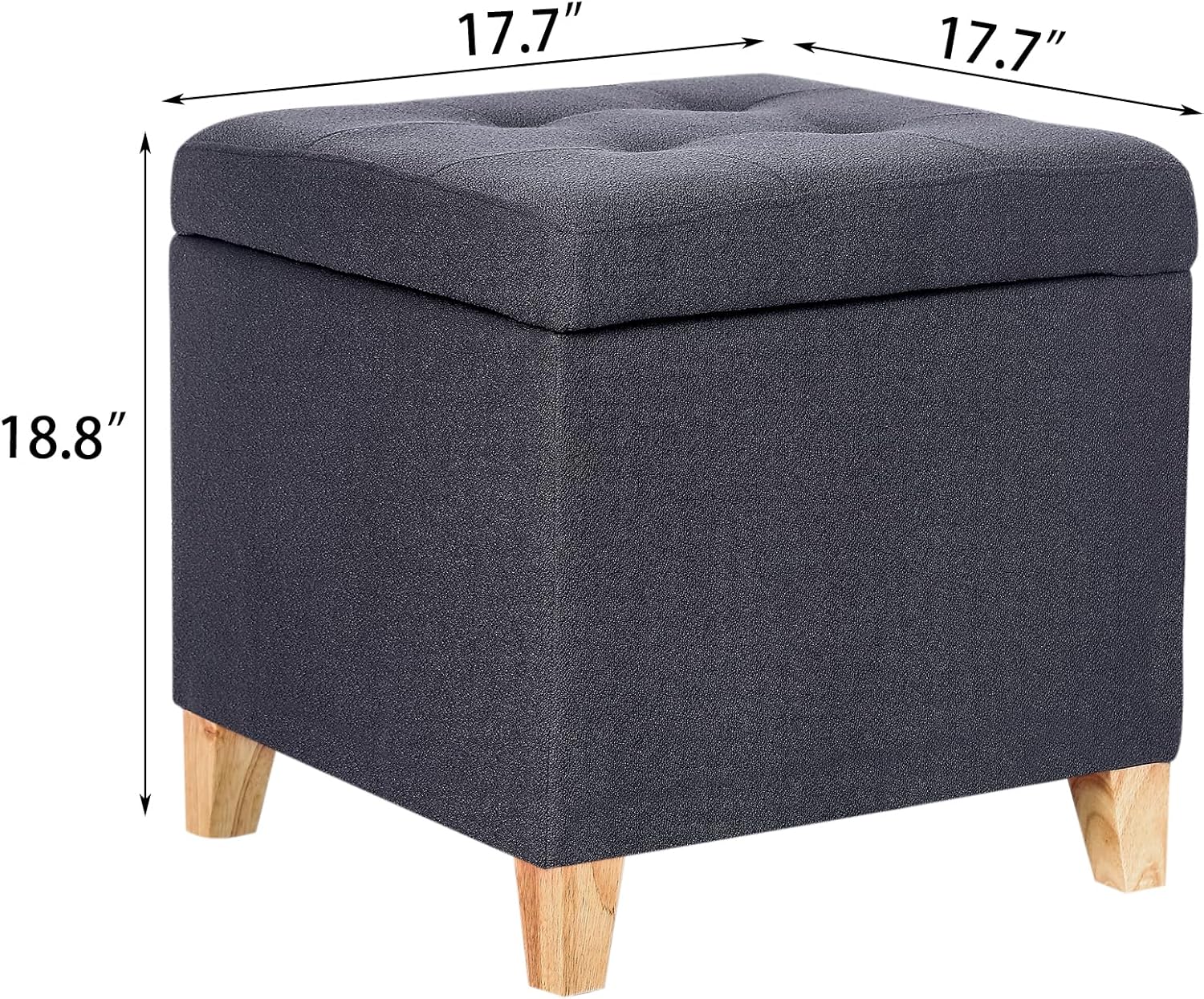 Adeco Fabric Storage Ottoman Bench with Solid Wood Legs, 17.7" Square Dark Grey Cotton Linen Cube Foot Stool, Upholstered Button Tufted Vanity Chair with Hinged Lid for Living Room, Bedroom, Dorm
