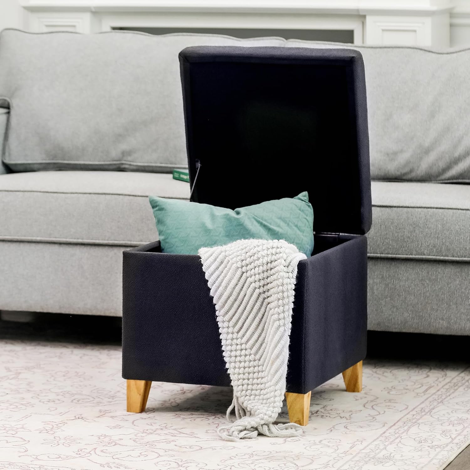 - Large Storage Compartment: Ottoman measures 17.7"L x 17.7"W x 18.8"H and space size: 13.78"L x 13.78"W x 11.61"H provide you enough space for your blanket and throw pillows.