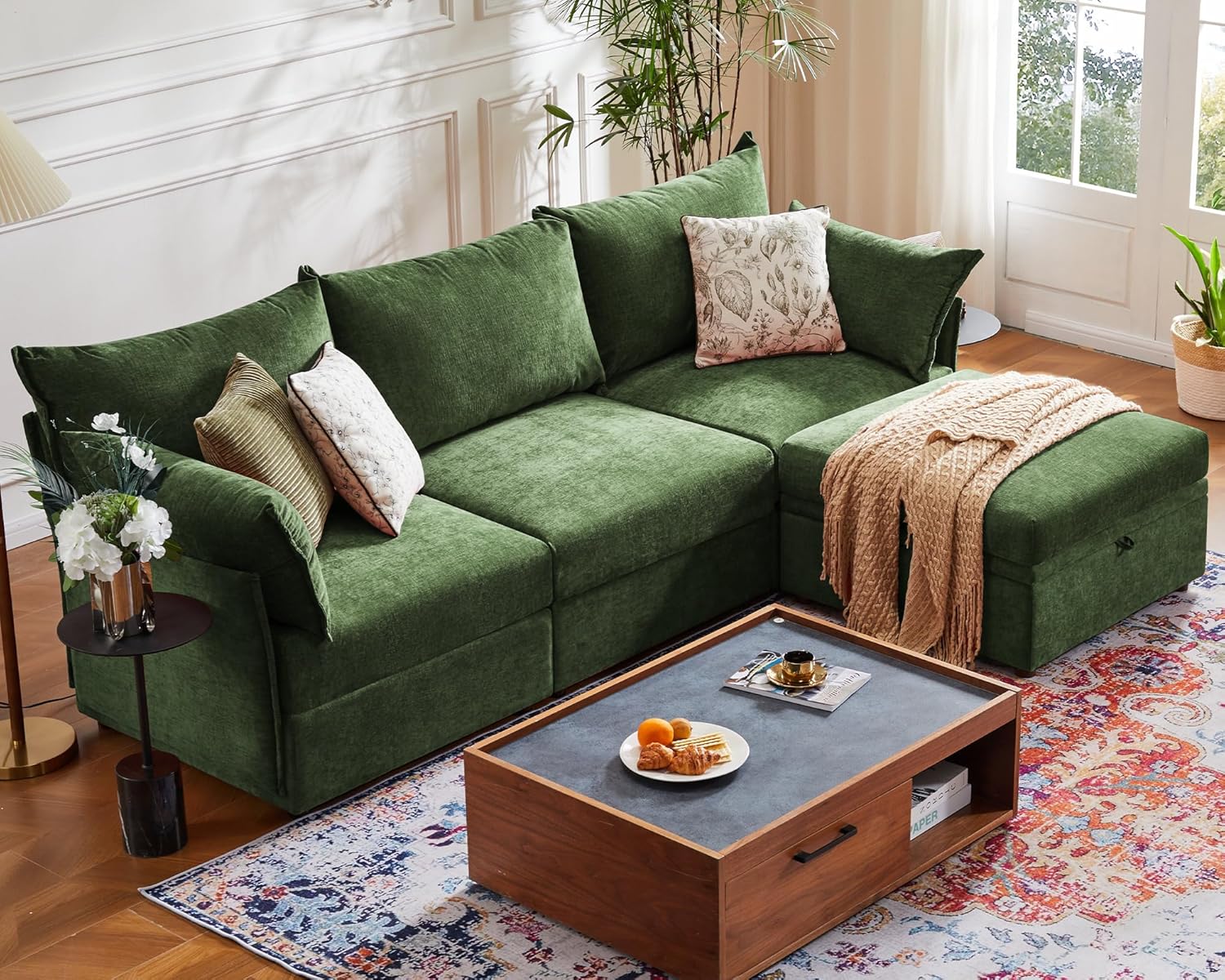 102.6" Modular Sectional Sofa, L Shaped Couch Set for Living Room, 3-Seater Comfy Cloud Couches with Movable Storage Ottoman,DIY Combination - Chenille Green
