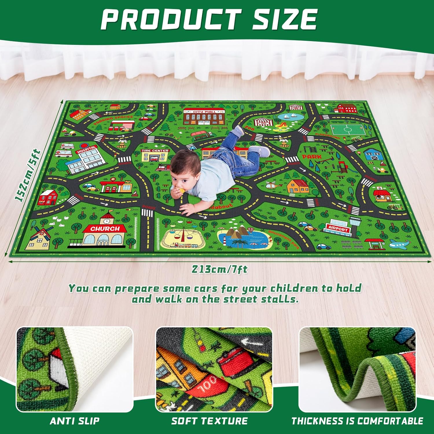 - Non Slip Kids Playroom Rug: this road traffic playrug featured with non slip and soft texture, provides a cushiony playfield that ensures safety during vigorous play; With a reliable non slip bottom, there's no risk of slipping or sliding; This kid baby and toddler friendly playrug ensure soft play times