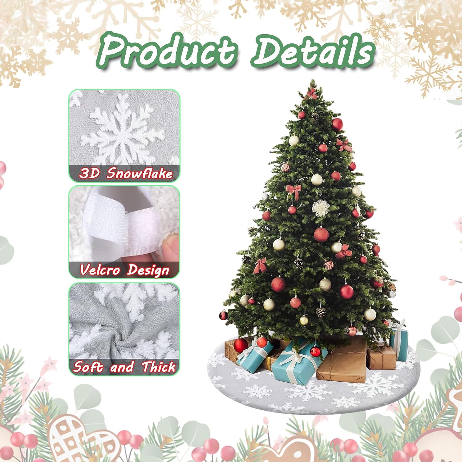 - ๐ ๐ ใLuxurious 3D large snowflakesใ - The beautiful tree skirt is designed with a handmade 3D large snowflake create a wonderful, magical effect. Grey plush and White snowflakes create a perfect Christmas scene.