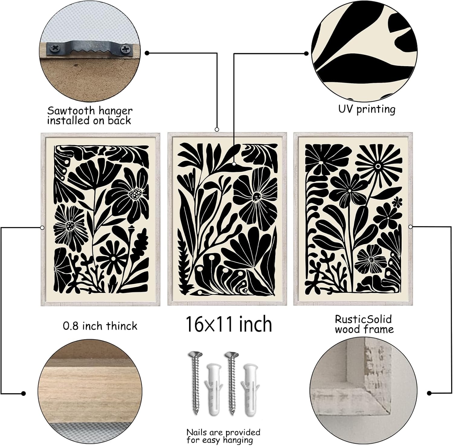 - 【Easy To Hang】: Set of 3 wall decor Saw-tooth hangers are installed on the back, and are equipped with screws for easy hanging.