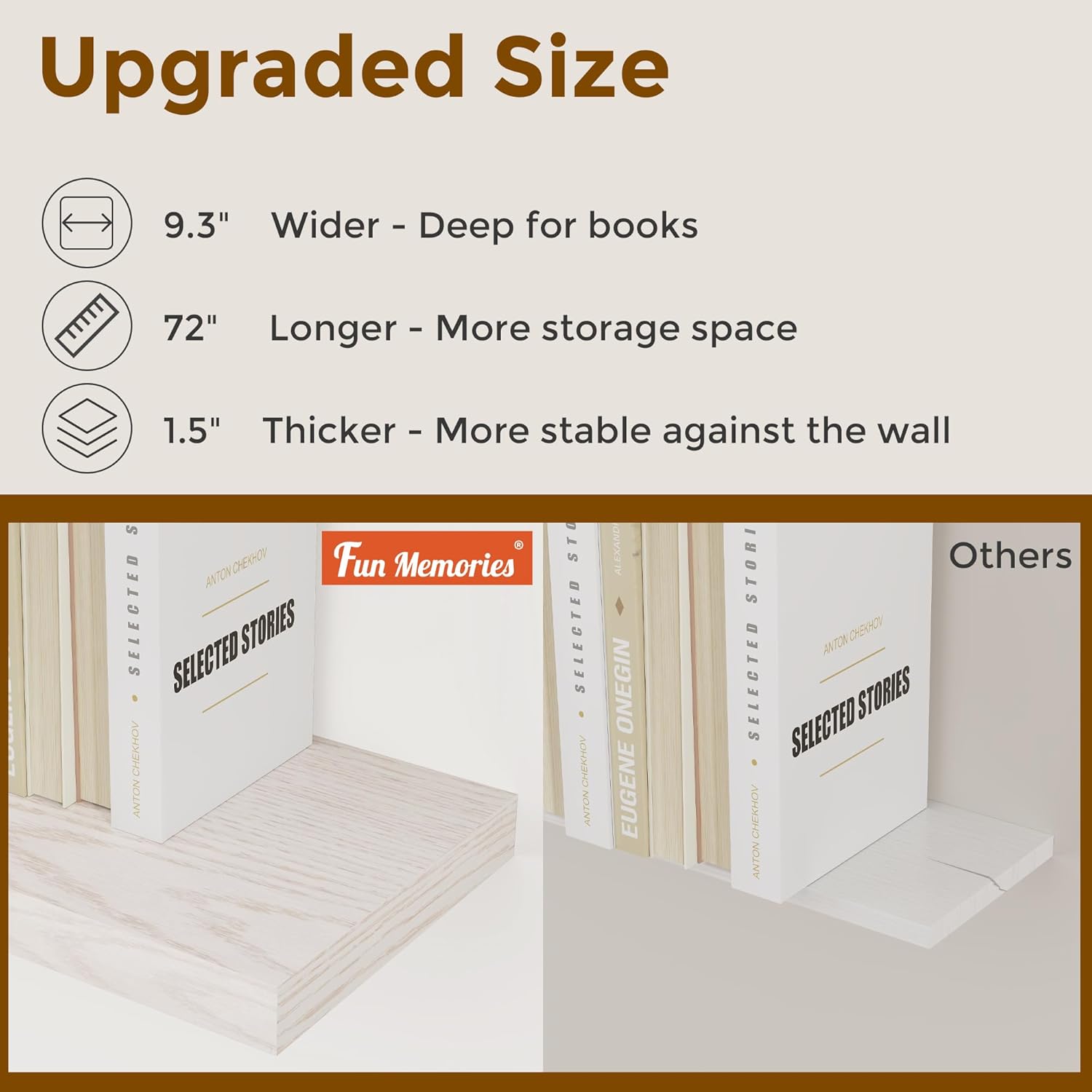 - 【9 INCH DEEP FLOATING SHELF】This extra deeper and thicker wall shelves are 9.3 inches in depth and 1.5 inches in thickness instead of the regular narrow floating shelves, you can put photos, pictures, DVD players, videos, books, toys, and some other knickknack on this beautiful display wooden shelf.