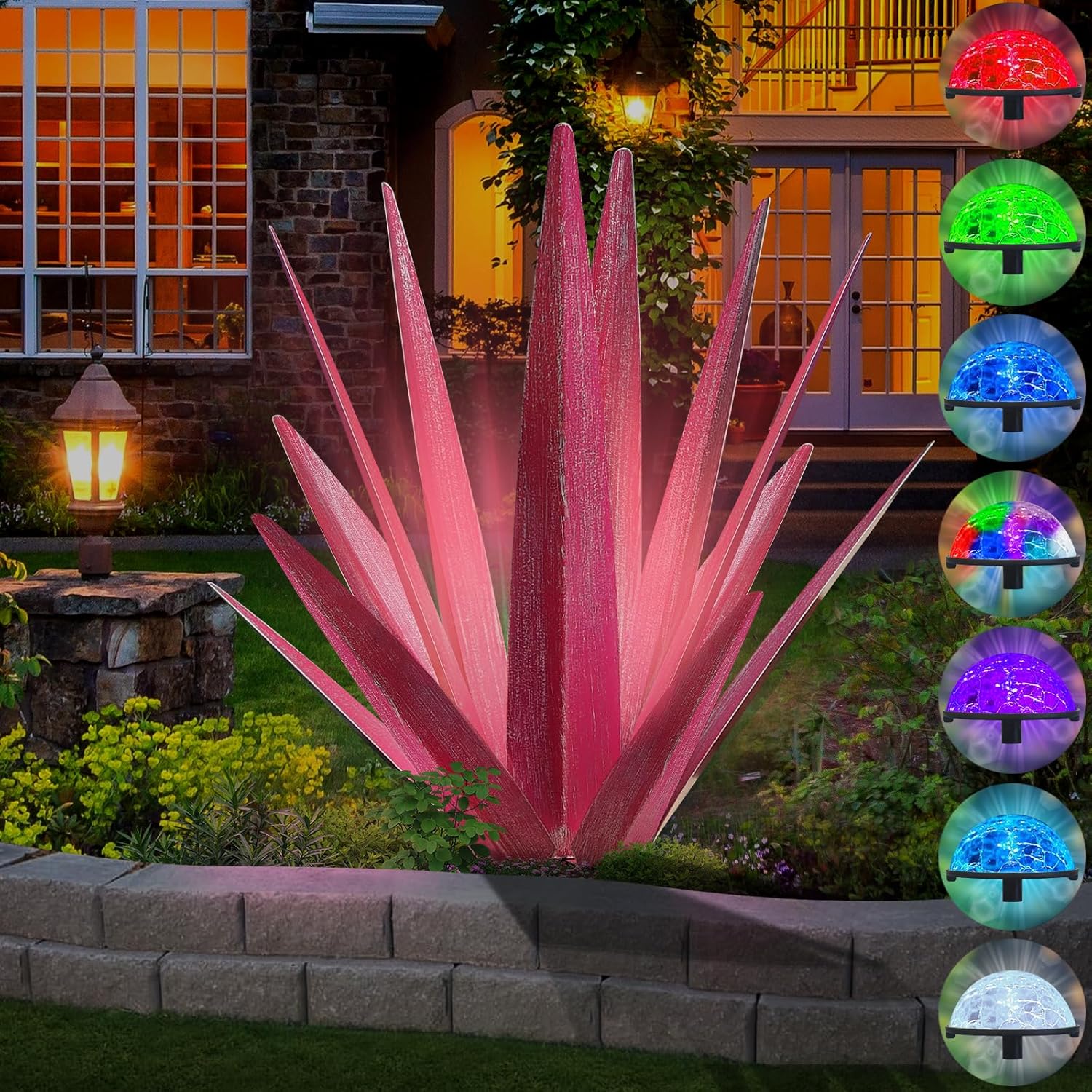 Large Tequila Rustic Sculpture, Rustic Metal Agave Plants for Outdoor Patio Yard, Home Decor Hand Painted Metal Agave Garden Yard Statue, Outdoor Lawn Ornaments (Rose Red - L (W/Solar Light))