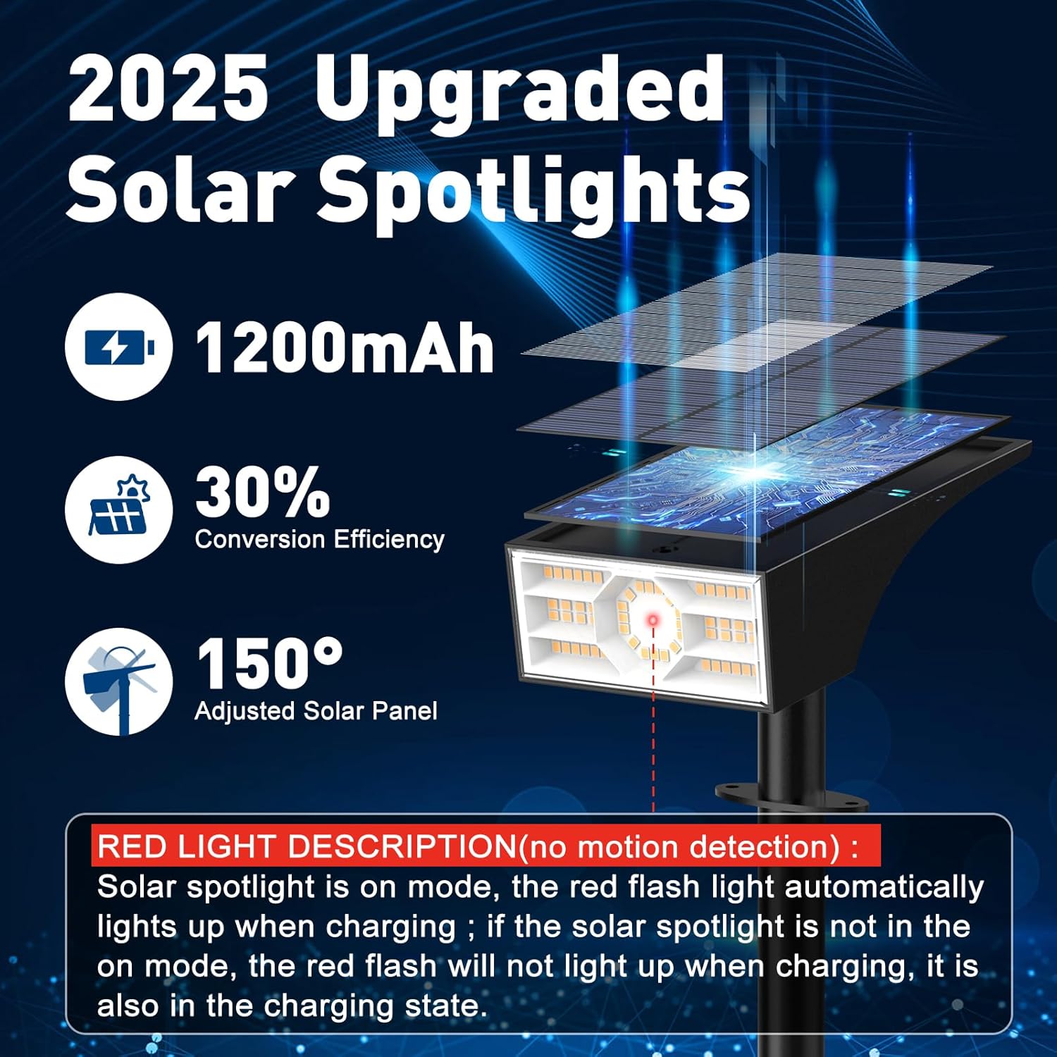- ใ๐๐จ๐ง๐ -๐๐๐ฌ๐ญ๐ข๐ง๐ ๐๐ฅ๐ฅ๐ฎ๐ฆ๐ข๐ง๐๐ญ๐ข๐จ๐งใ Equipped with 56 LEDs, our solar spotlights create the perfect lighting effect wherever they are placed. The 150ยฐ adjustable head allows you to direct light exactly where you need it. Harness the power of the sun to brighten your garden without high electricity costs. With a maximum brightness of 1000 lumens, these solar landscape spotlights provide 8-18 hours of illumination depending on charge timeโlonger, brighter, and more durable than other solar spotlights on the market.