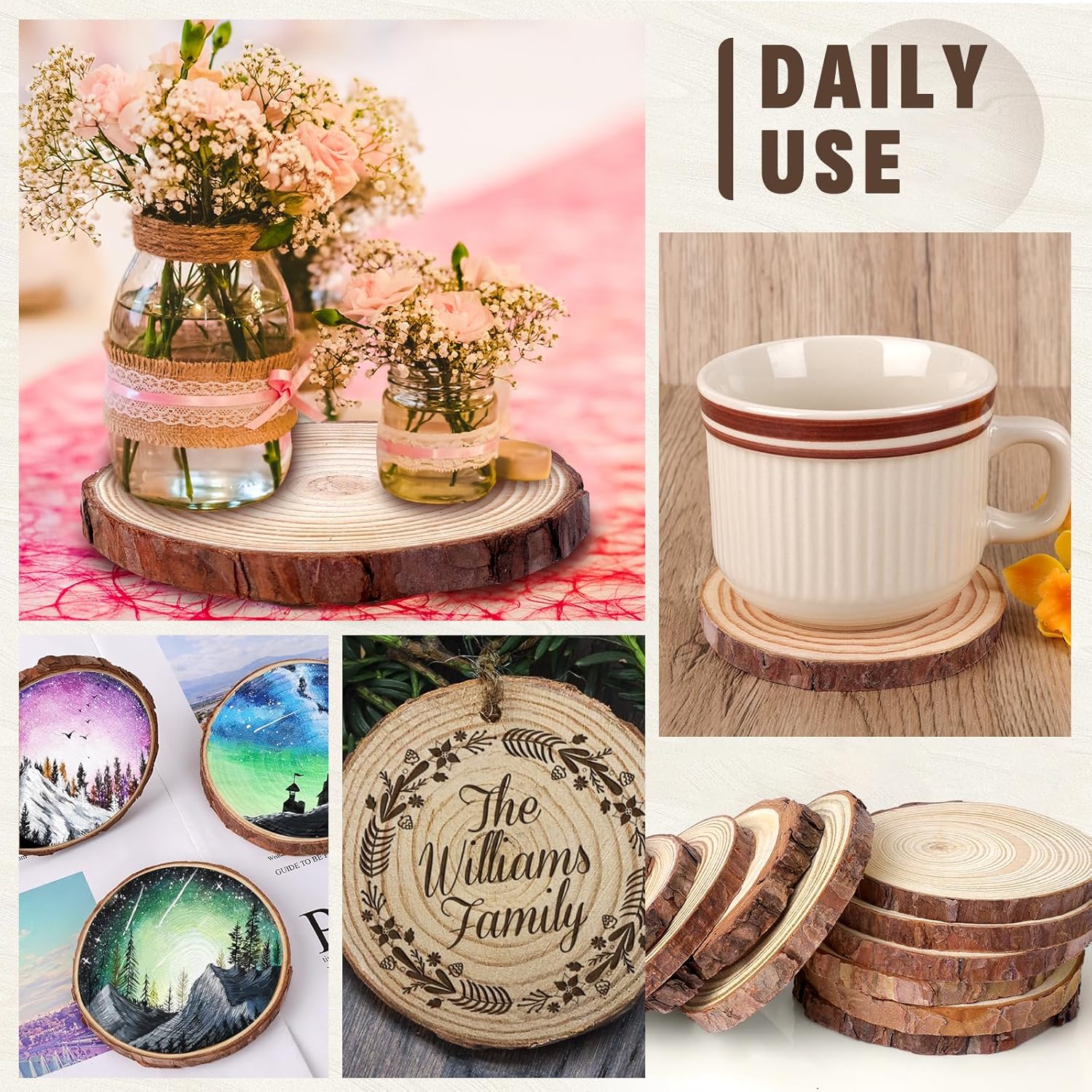 - Widely Use: Wooden Rounds can be used as a Christmas ornament, wedding decoration, wall decoration, coasters, and various handmade crafts.