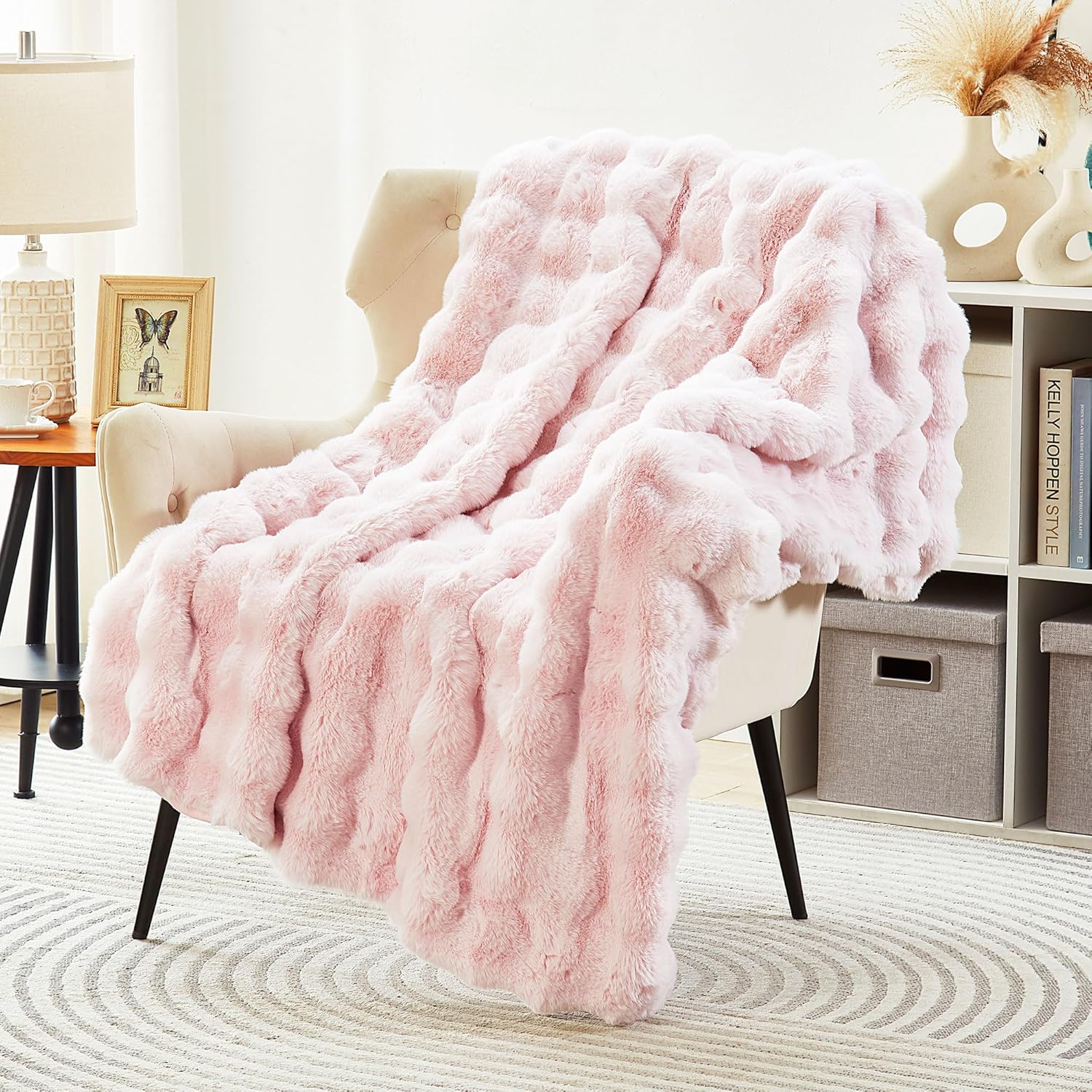 - 【Exquisite carft make the bubble stable】Our luxe large fuzzy furry rabbit faux fur throw blankets are well made in every process. We gurantee its skin-firendly and eco-friendly due to premium microfiber selection. High-end weaving ensure the durable and fairly uniform of each bubble. Neat stitching with minky fleece velvet is not only a brilliant match,but also provide extremely soft and warm. Various chic color adoption decorate the bubble bright and colorful. You can choose the color that suits you best.