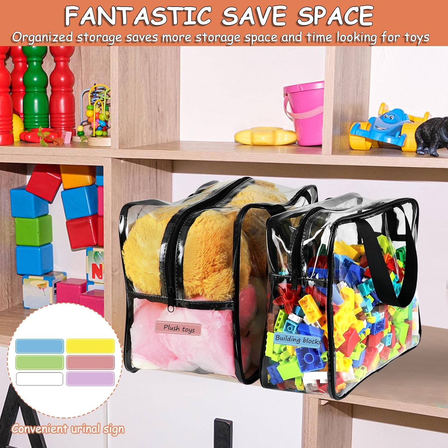 - 【Heart-Warming Design】: The toddler zipper storage bags for kids have an overall transparent design, so children can easily see and find the toys inside they want. Storage bags for toys have two handles, which have a stronger load-bearing capacity and are more sturdy for carrying toys, books, etc. when going out. Included name labels help you write names or store them in categories