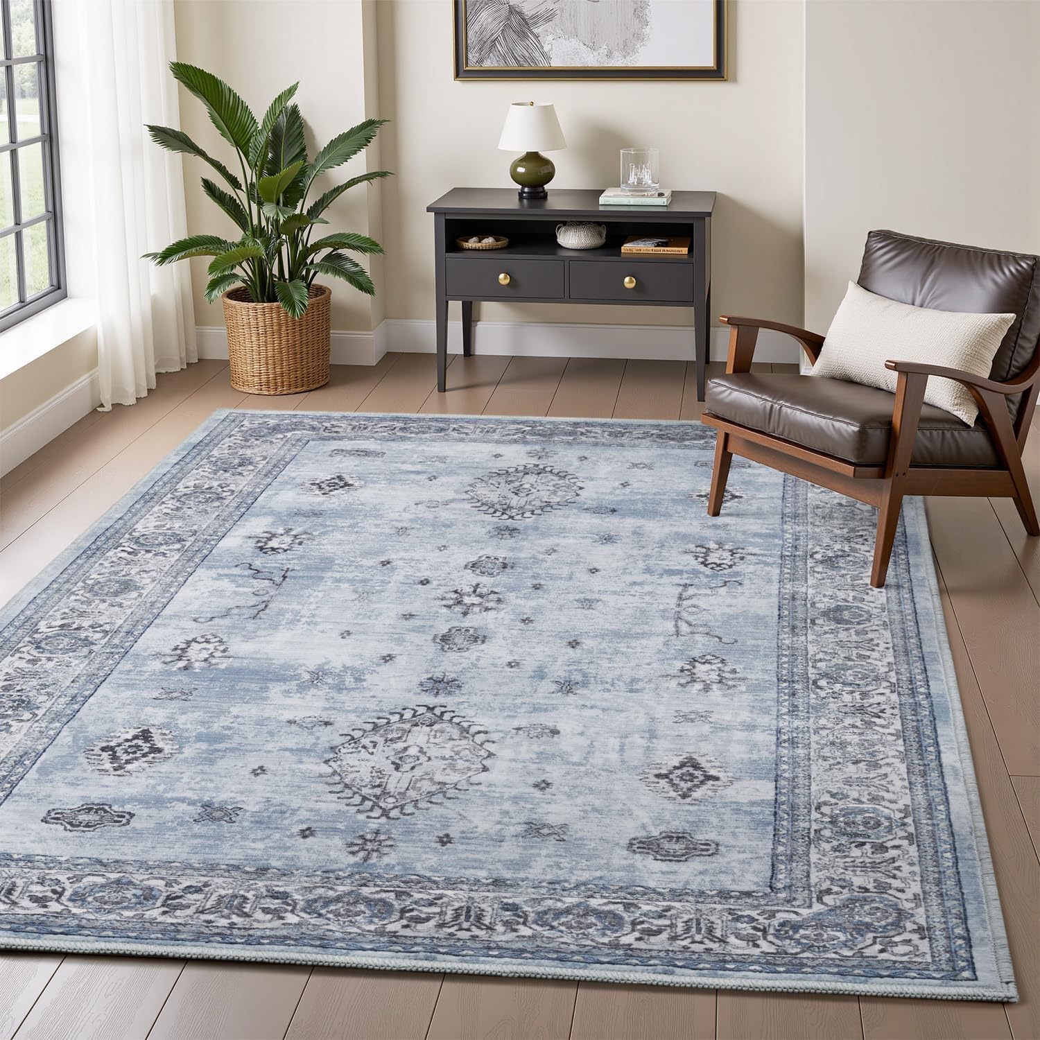 AMOAMI-Vintage Area Rug 4x6 Blue Rugs for Living Room-Soft Living Room Rug Non Slip Rugs for Bedroom Carpet Machine Washable Rug for Dining Room Bedside Office Room Decor
