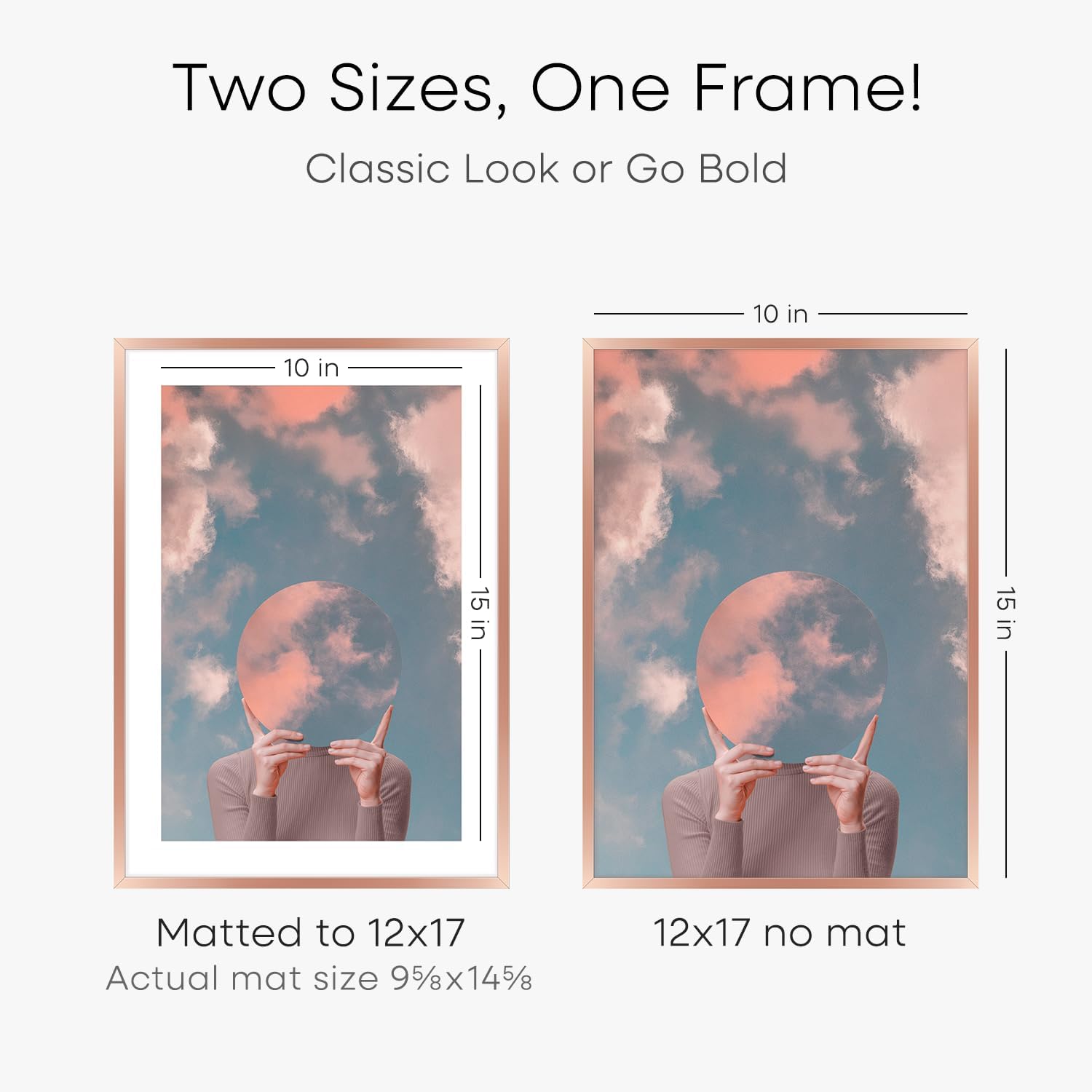 Homeforia 12x17 Picture Frame Rose Gold, High End Metal 12x17 Poster Frames with Mat 10x15 Photo, 12 x 17 Rose Gold Frame Matted to 10 by 15 Print, 17x12 Thin Frame, Tempered Glass, Wall Kit, Set of 1