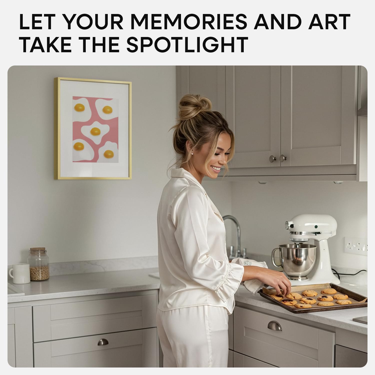 - SUBTLE GLOW. SIMPLE FORM. This frame’s polished champagne gold hue adds just enough shine to catch the eye. Clean lines and a minimalist build keep the look modern and uncluttered.