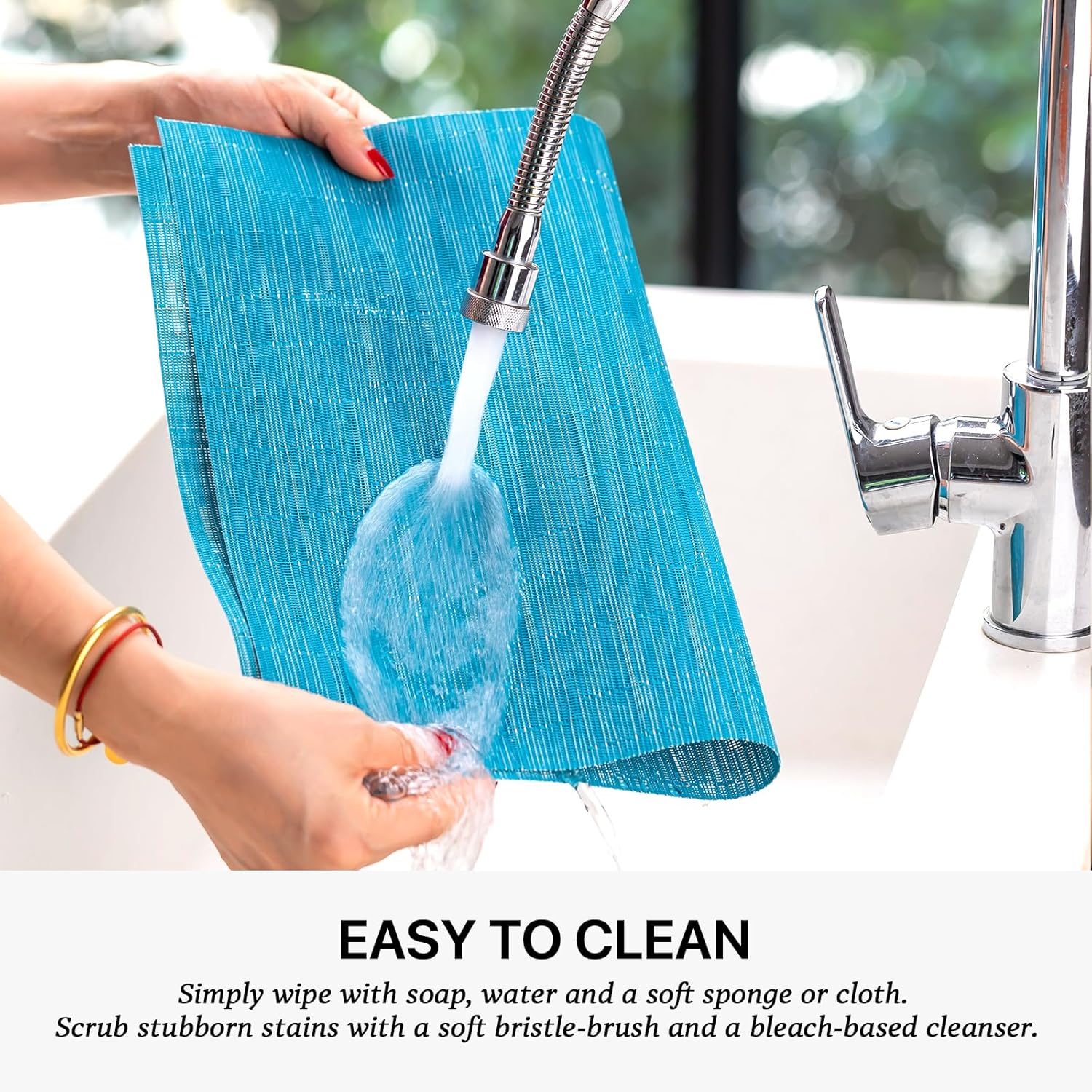 - EASY TO CLEAN:The washable placemats can be washed repeatedly.How to clean the place mats for kitchen table:Simply wipe with soap,water and a soft sponge or cloth.Scrub stubborn stains with a soft bristle-brush and a bleach-based cleanse.