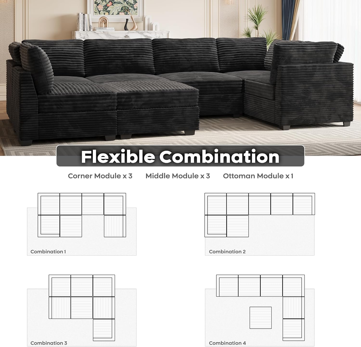 ovios Sectional Sofa Couch with U-Shape Chaise Sofa Bed, Comfy Modular Cloud Couches with Deep Seat, Modern Upholstered Plush Corduroy Sofas Set for Living Room, 7-Seater, Black
