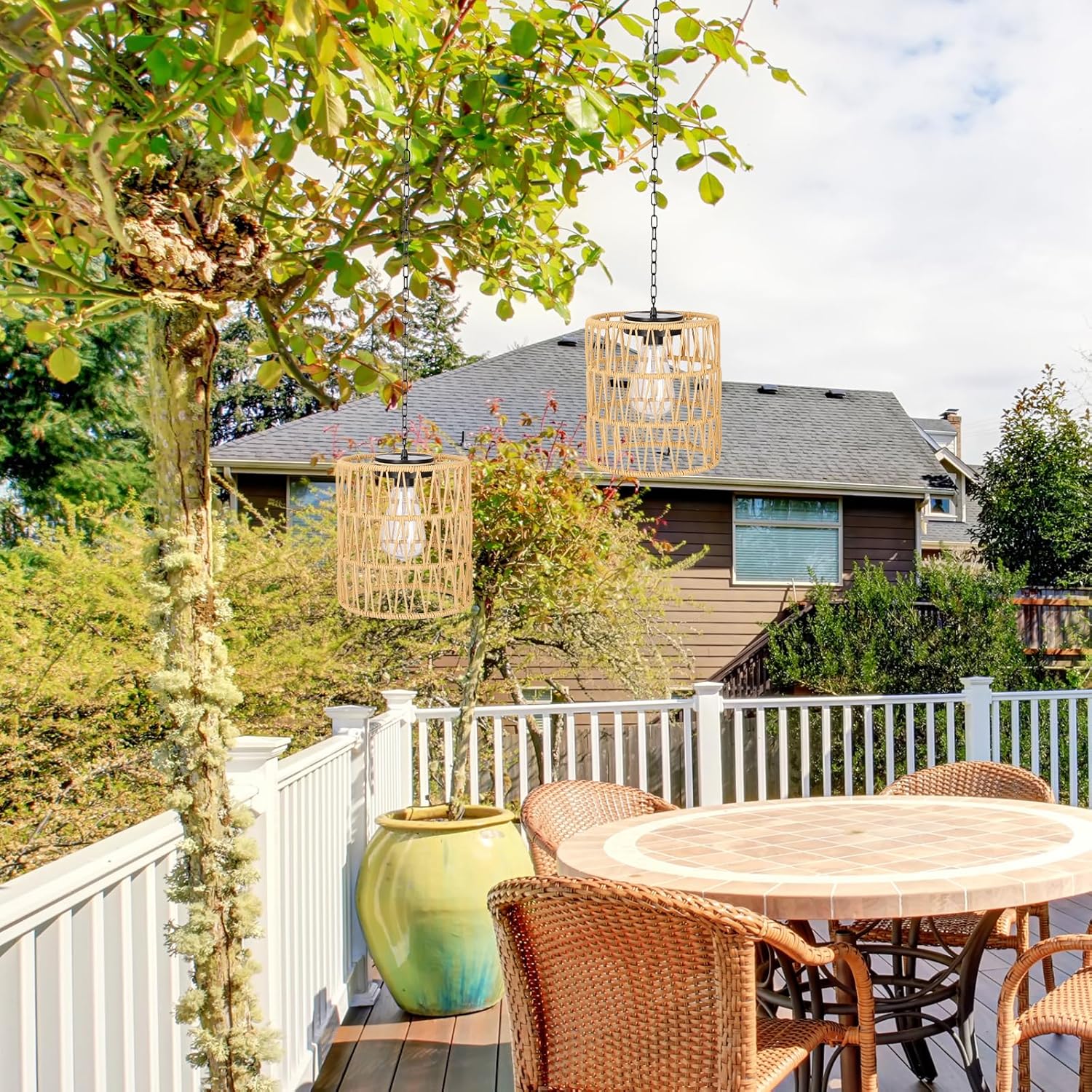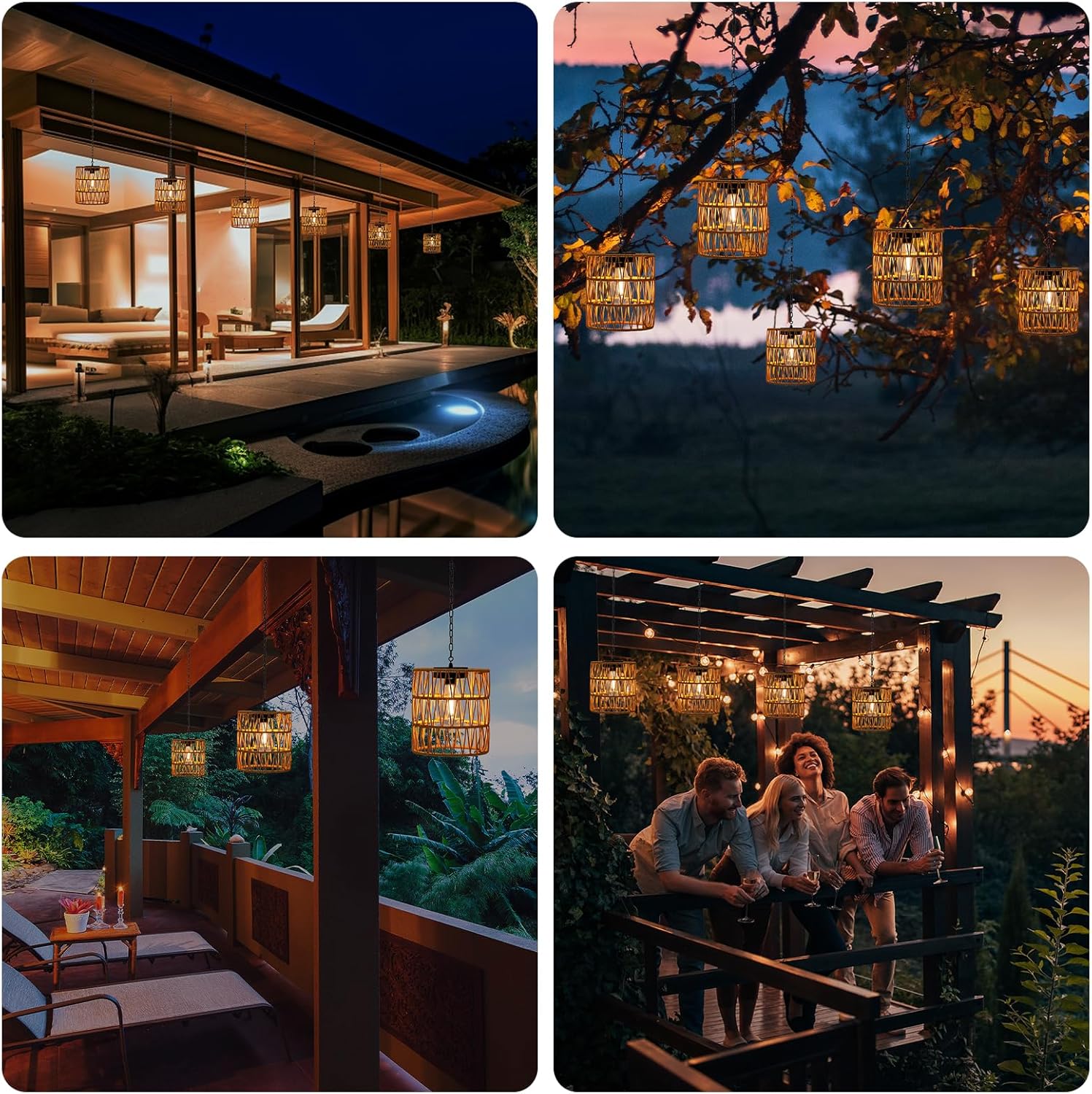 Livinlarge Solar Chandelier Lantern,Outdoor Rattan Pendant Lights,Waterproof Boho Hanging Lamps with Edison Bulb for Gazebo Tree Porch Yard Porch Patio Garden Backyard Decor
