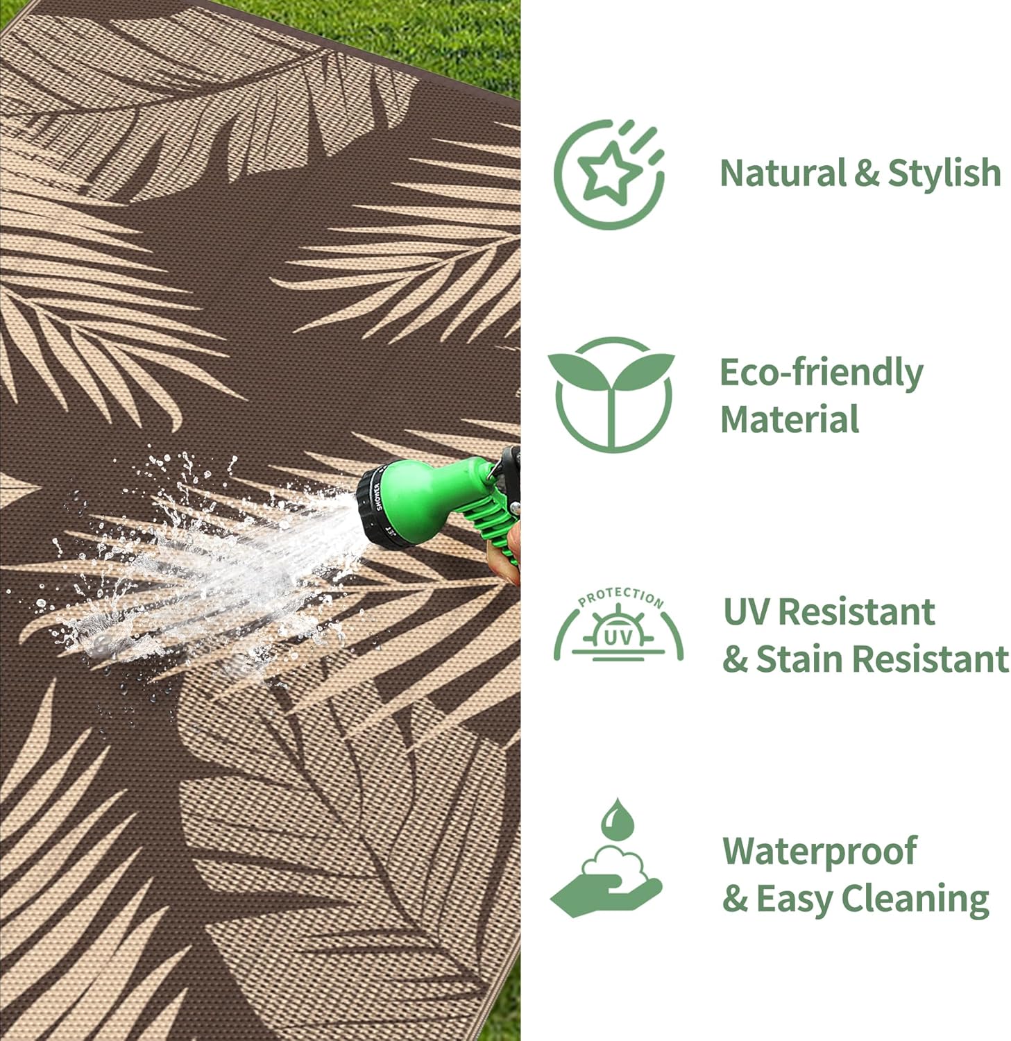 - Waterproof & Easy To Clean: Our indoor and outdoor rugs are waterproof, stain resistant, non-slip, easy to clean and well-breathable. As an outdoor patio rug or picnic mat, you don't have to worry about drink spills, food stains, sand or dirt, just rinse with water or wipe with a damp cloth. Plus, the breathable material allows it to air dry in minutes. You can enjoy your exclusive leisure time with your family or friends outdoors or indoors without any worries