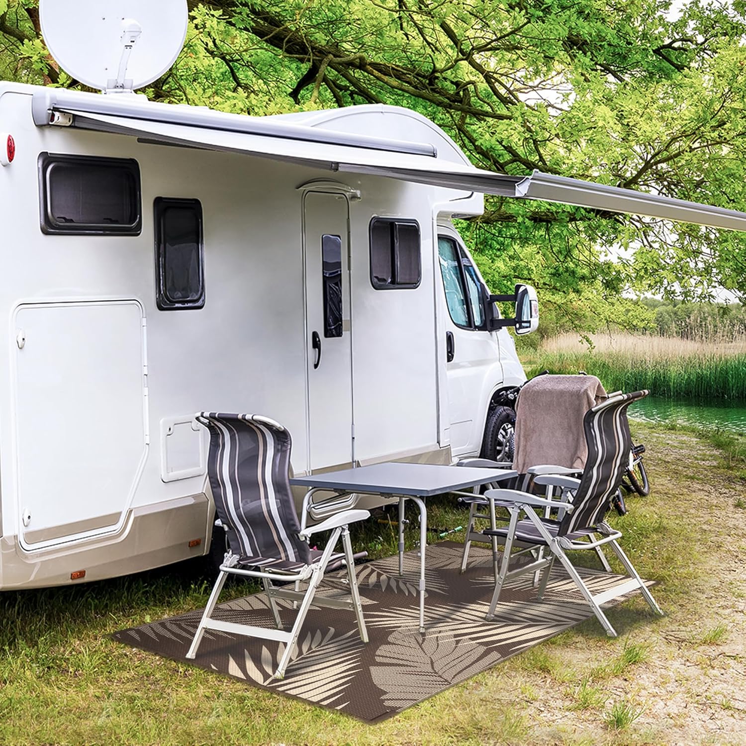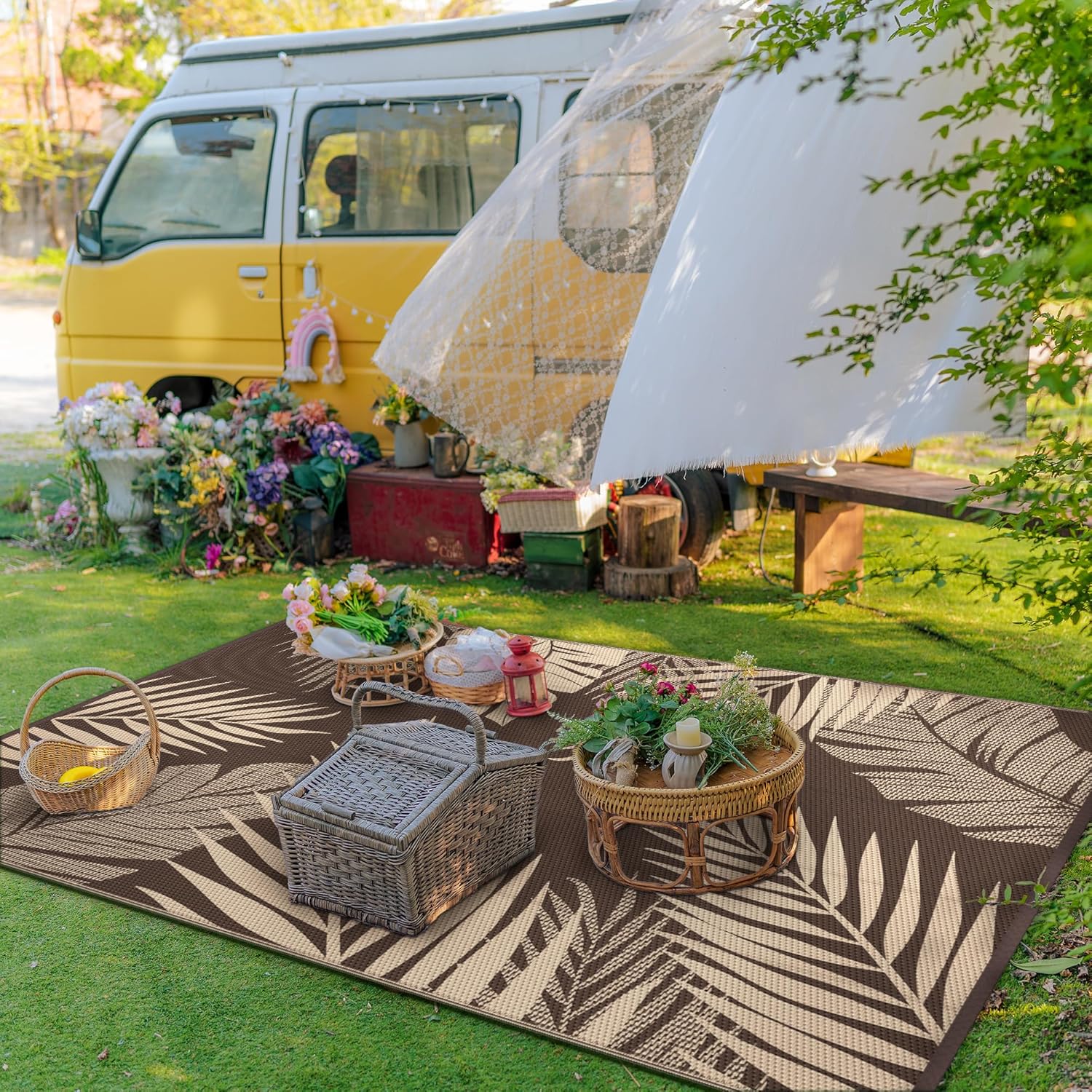 - Perfect Choice For RV Camping: Woven from lightweight plastic straws, these RV outdoor rugs fold compactly to fit in the included carry bag. This portable waterproof outdoor rug is easy to carry, with 4 corner loops and stakes to secure it. Using this camper rug reduces travel fatigue and adds plenty of space for fun — also a stylish touch for fall decor when setting up your campsite