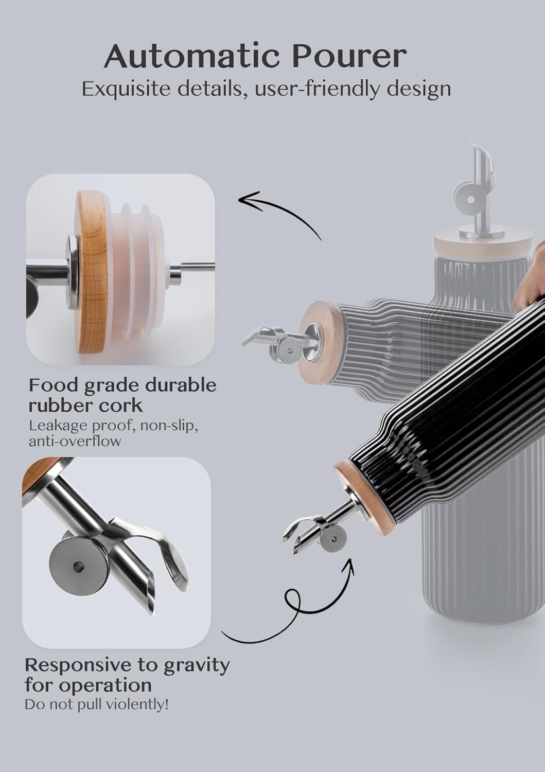- Gravity-Driven Auto Spout: The gravity-driven spout opens automatically when the bottle is tilted and closes when it is upright, offering precise pouring control without drips or spills. Simplify your kitchen with this multi-use oil and vinegar dispenser bottle.