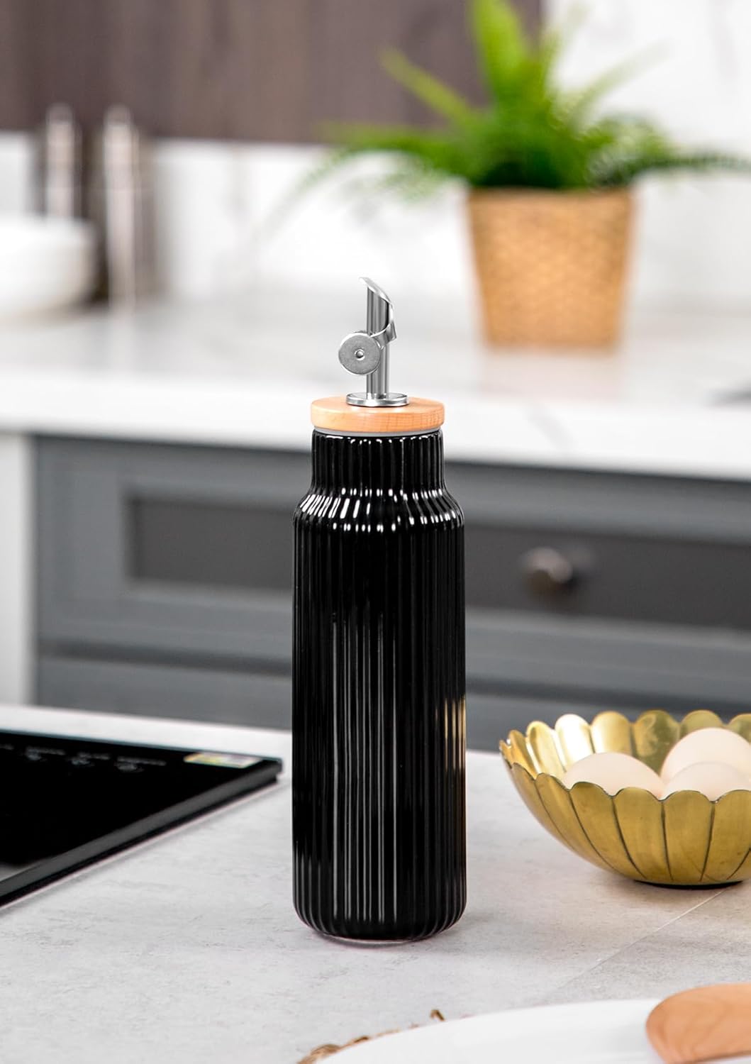 - Stylish Design & Versatility: Our 14oz ceramic oil dispenser bottle features a striped exterior for a secure, comfortable grip, making it easy to handle and slip-resistant. Ideal for olive oil, it's also great for vinegar, coffee syrups, and other cooking liquids.