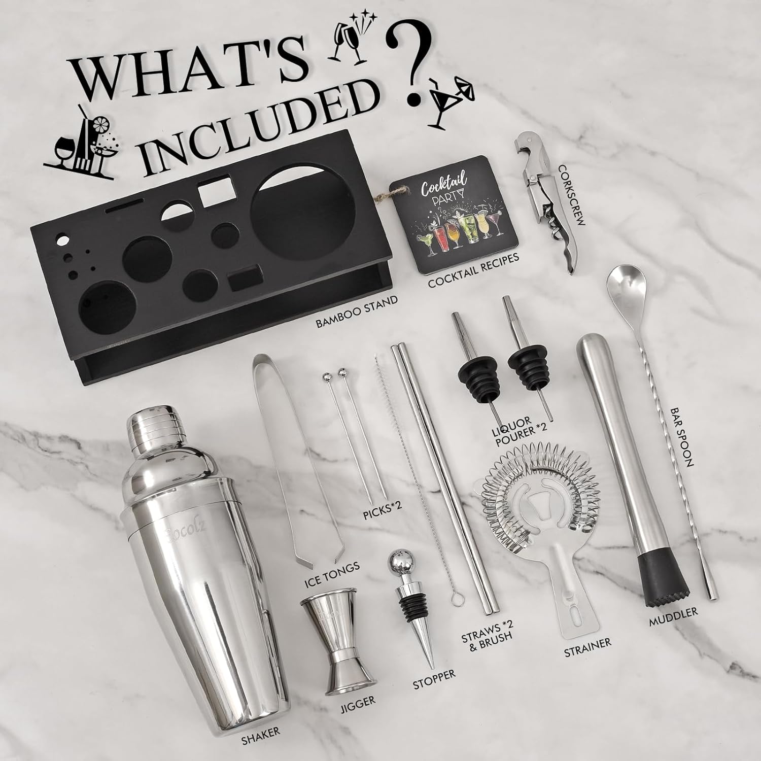 - Make Drinks Professional Tool Set: This 17-piece cocktail shaker set contains most essential bartending tools needed for start mixing drinks, 25 oz martini shaker, double jigger, bar spoon, muddler, strainer, ice tongs, liquor pourers, corkscrew, straws with brush, stopper, picks, Recipes and stand