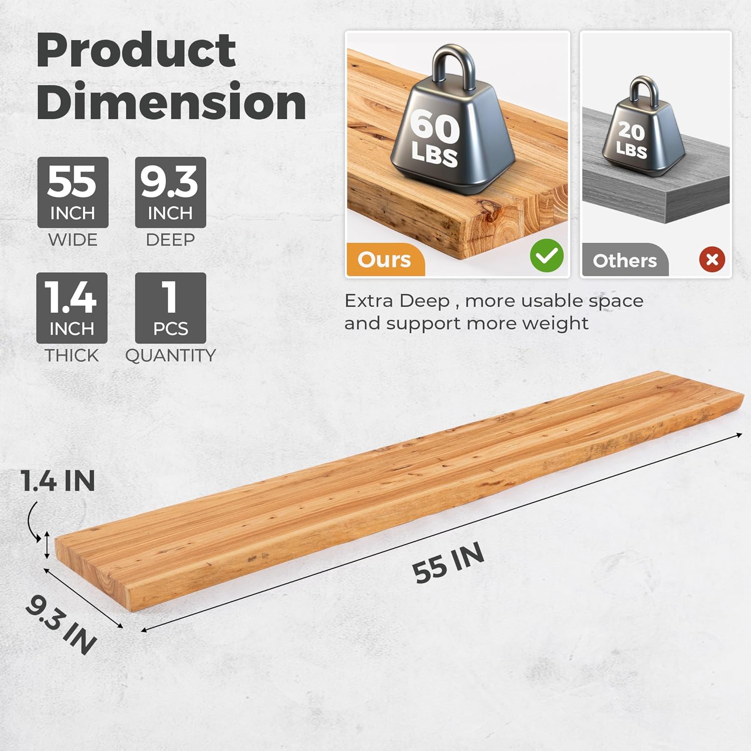 RICHFOCUS Live Edge Elm Floating Shelves - 55" W x 9.3" D Rustic Solid Wood Wall Shelves with Invisible Bracket, Wall-Mounted for Living Room, Bedroom, Kitchen Storage & Display, Set of 1, Natural