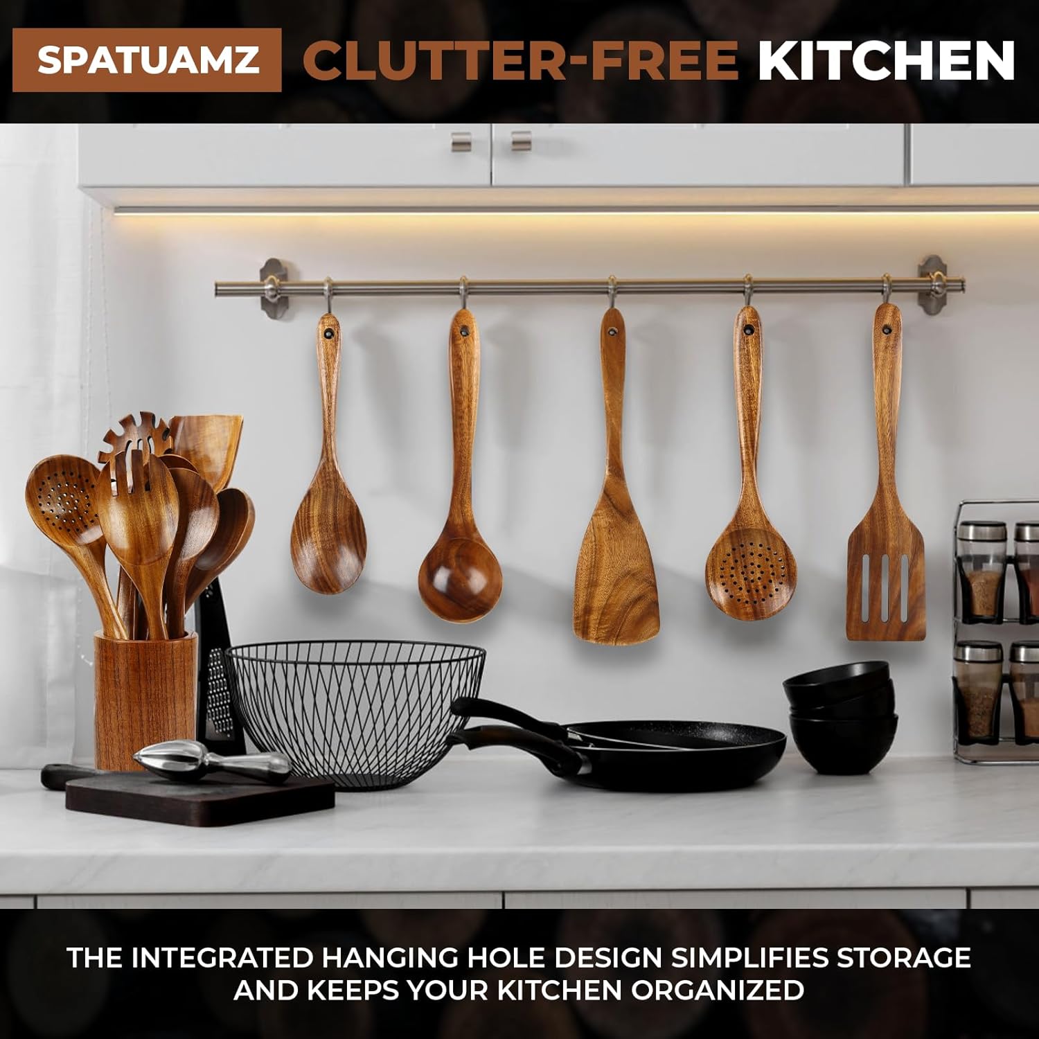 SPATUAMZ Teak Wood Spoons for Cooking, Elegant Wooden Cooking Set of 10, Excellent Kitchen Cooking Utensils Set for Home