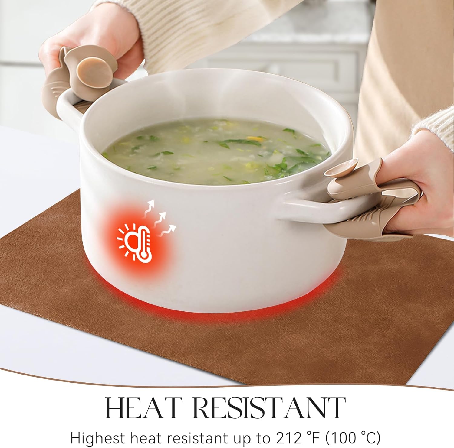 - HASSLE-FREE CLEANING: Our faux leather placemats are designed to be 100% waterproof to better protect the table from grease and grime compared to woven and fabric placemats. If the placemats get stained with sauce or food residue, simply wipe with a cloth or rinse with water.