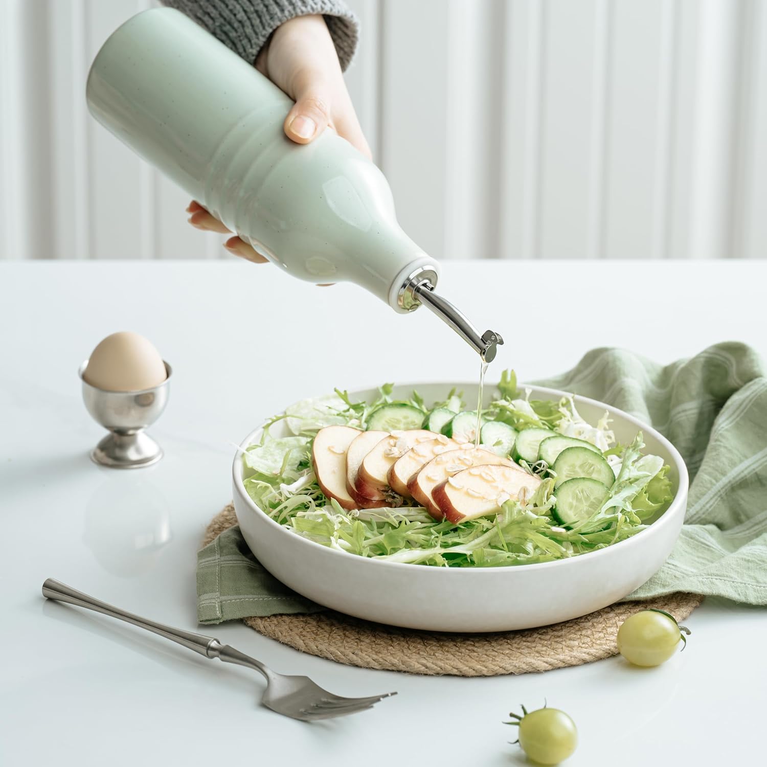 famiware Jupiter 16oz Ceramic Olive Oil Dispenser Bottle, 1 Piece Oil Dispenser for Kitchen with Stainless Steel Pourers, Suitable for Storage Vinegar, Soy Sauce, Coffee Syrup, Light Green