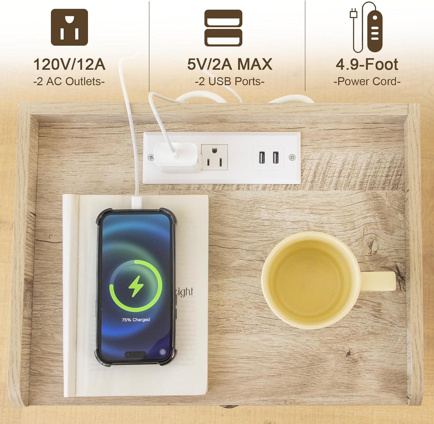 - Multifunctional Nightstand: This modern nightstand with the charging station is equipped with 2 USB Ports and 2×3-Prong Power Outlets that can meet your needs to charge phones, iPads, laptops, and desk lamps easily. The 4.9-foot-long electrical cord makes phones, and ipads when charging that also is within your arm’s reach