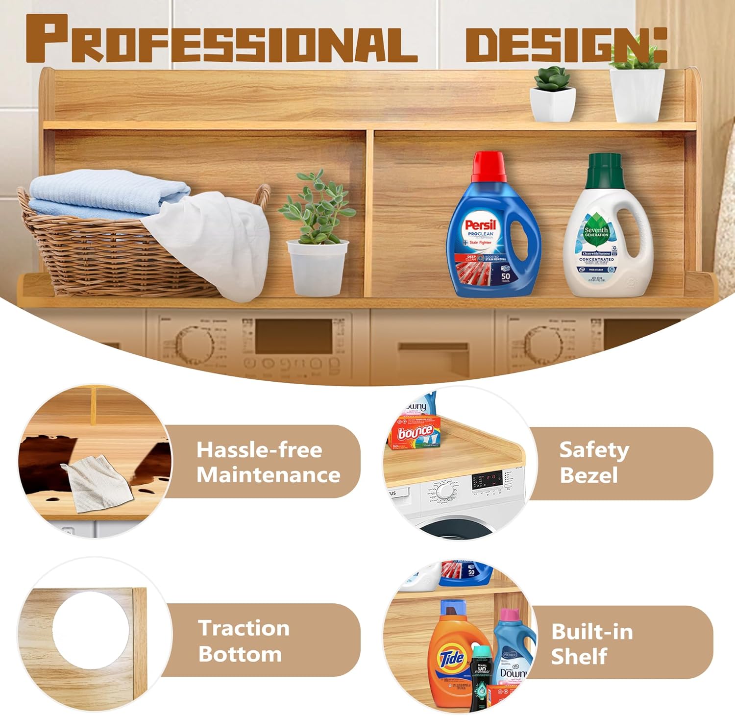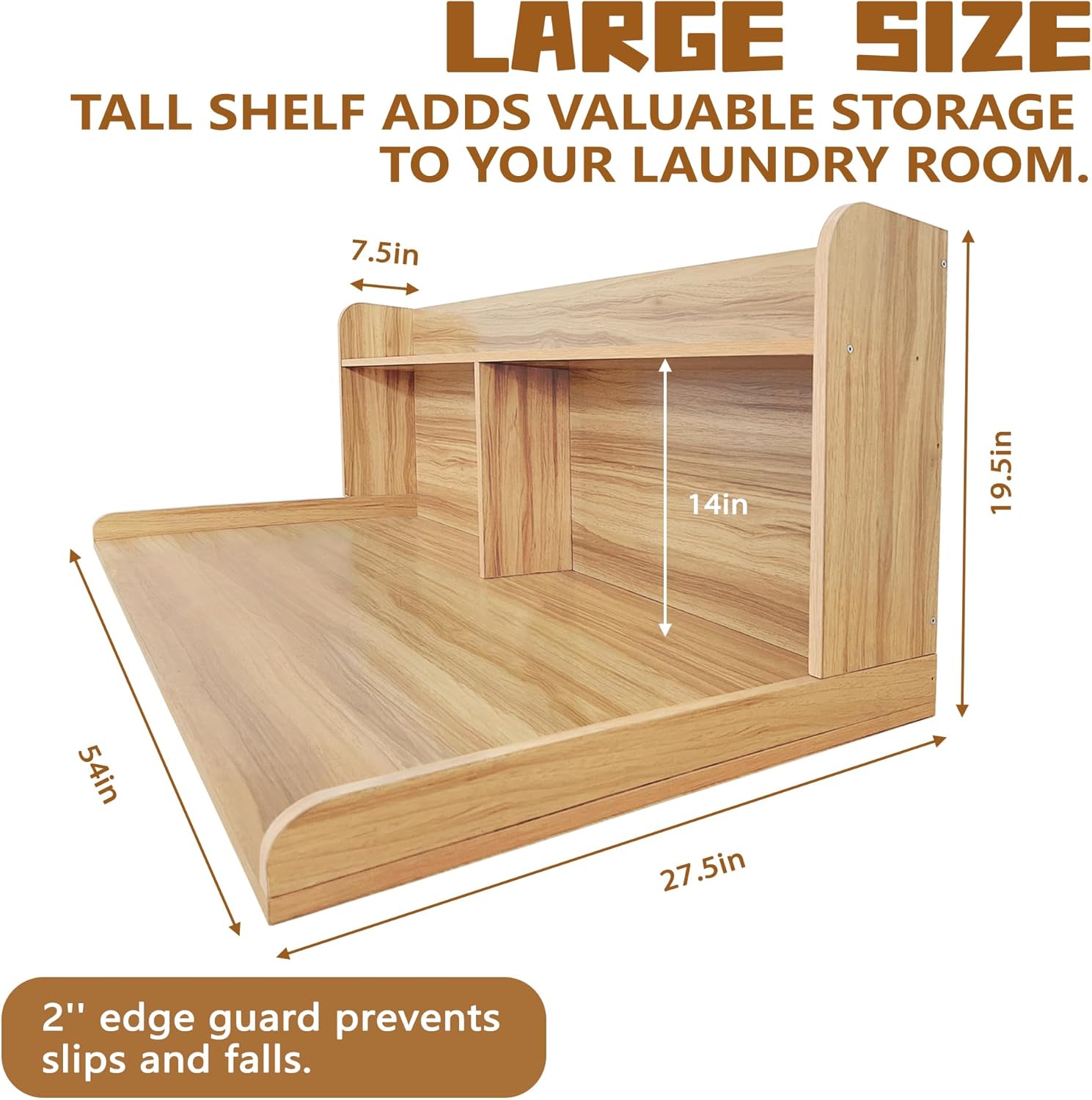 - 【Enhanced Space with Extra Shelf】With dimensions of 54" W x 27.5" D x 19.5" H and an additional 20'' high back shelf as a unique advantage than others, our countertop is crafted to universally fit most washer and dryer combinations. Whether you're folding, sorting, or organizing, this countertop delivers a streamlined, clutter-free experience. The extra shelf maximizes your laundry room’s efficiency, providing ample space for detergents, softeners, and other essentials, ensuring your laundry routine stays organized and hassle-free.