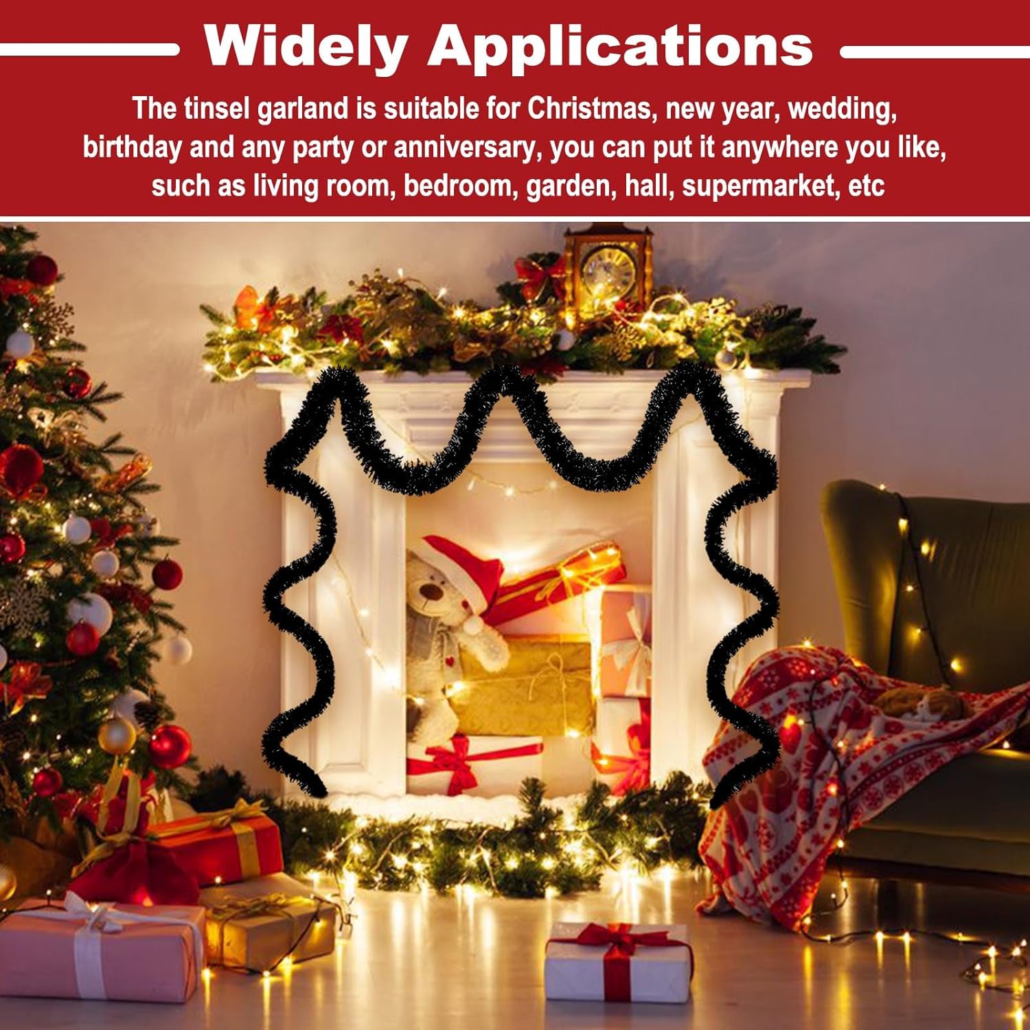 - Wide Application: Suitable for all kinds of special days, such as christmas, new year, valentine's day, halloween, festivals, wedding, engagement, bridal baby shower, graduation celebrations. The tinsel garland are perfect decorations for party, home decorations, parade float, garden, christmas tree, christmas wreath, wall, ceiling, door, hedge, stair rail, doorway, window, pole, table and so on