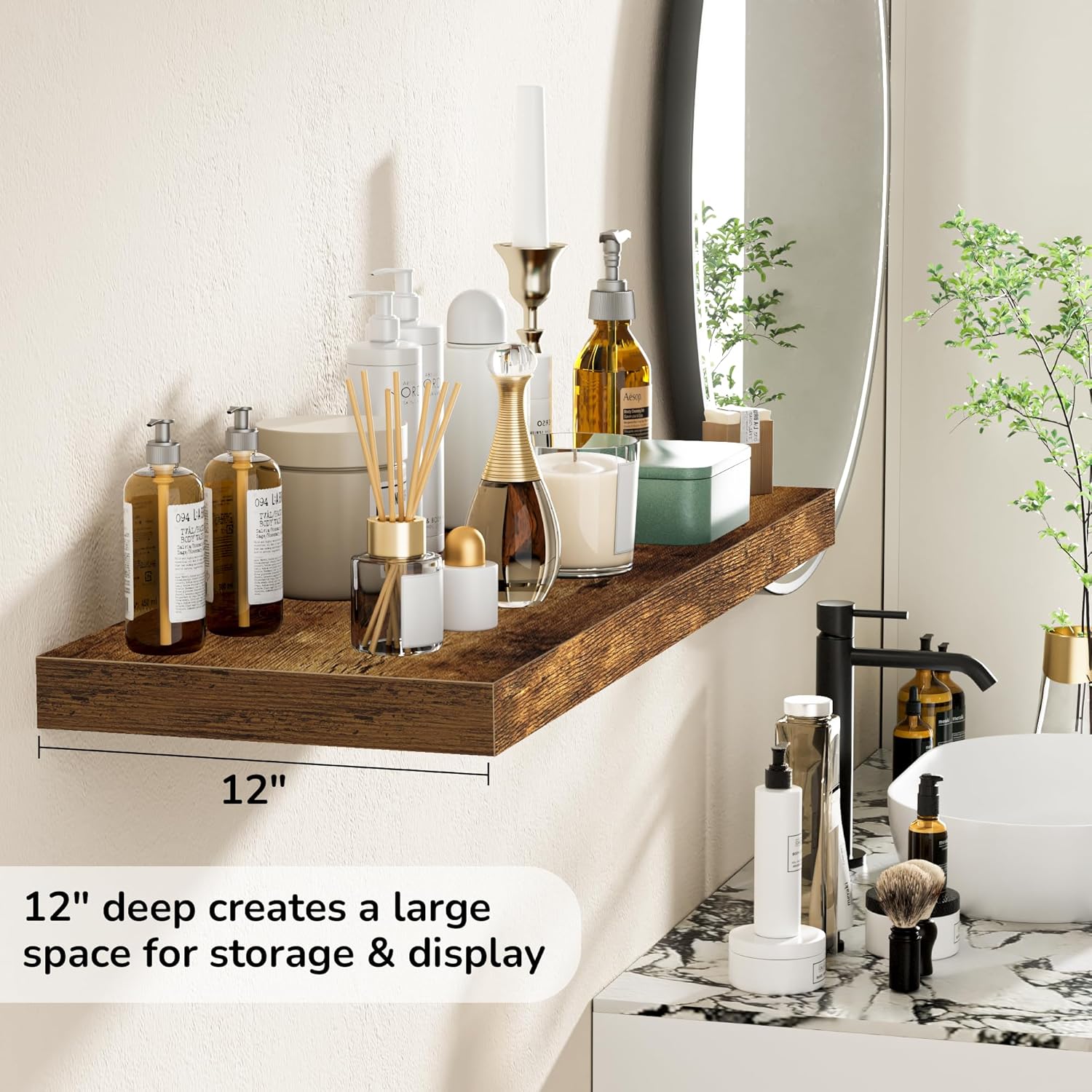 - Versatile & Multi-Scene Functionality: Our floating shelves are available in a variety of sizes and thicknesses, allowing you to choose the perfect fit for your space. Use them in the bathroom to store beauty products, hair care items. In the bedroom, they can hold books, cosmetics, and personal items. In the kitchen, they’re perfect for spices, jars, or small utensils. Or display photo frames, trophies, or collections in the living room. These shelves efficiently use wall space to create a tidier, more spacious feel in any room.