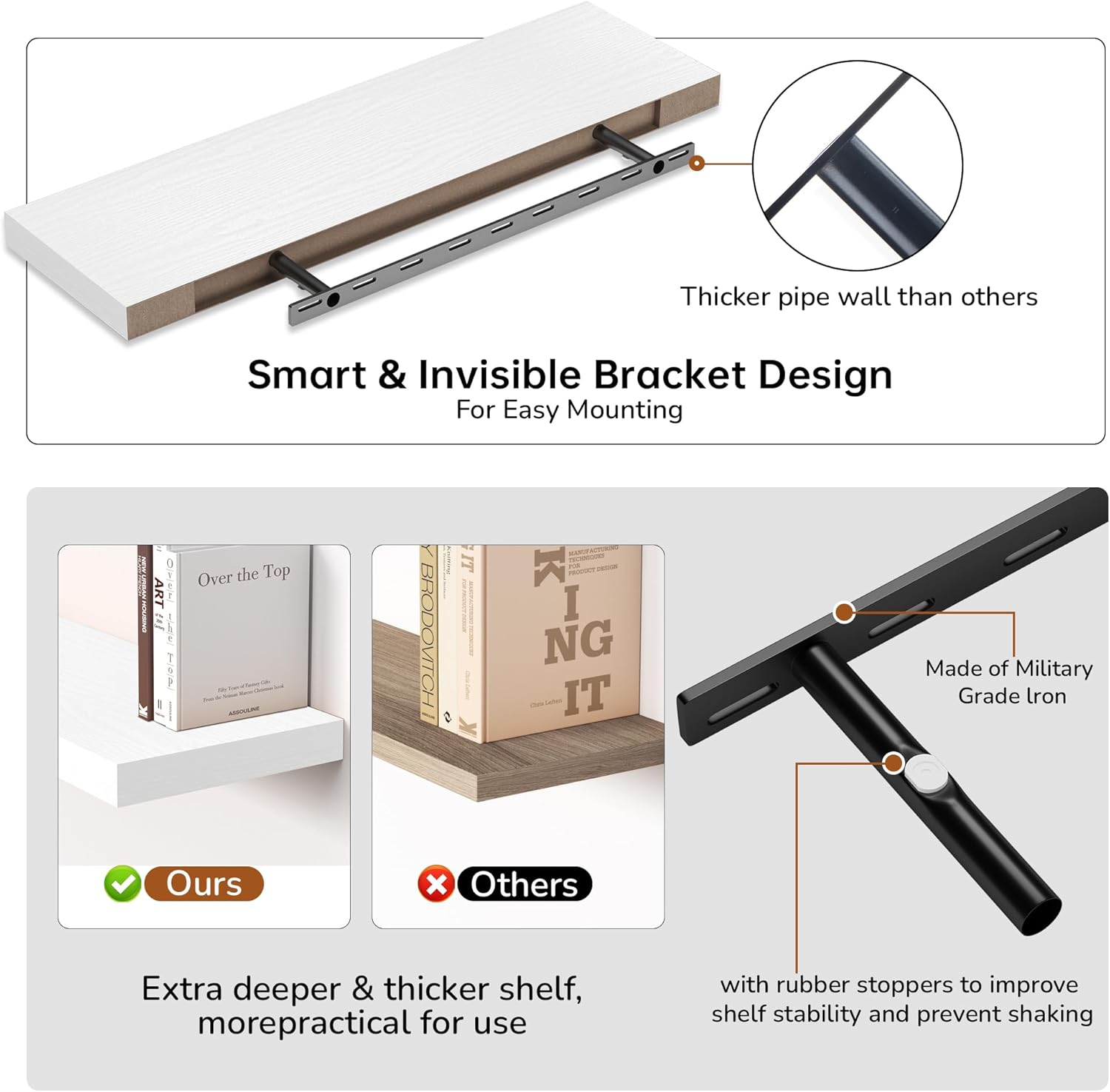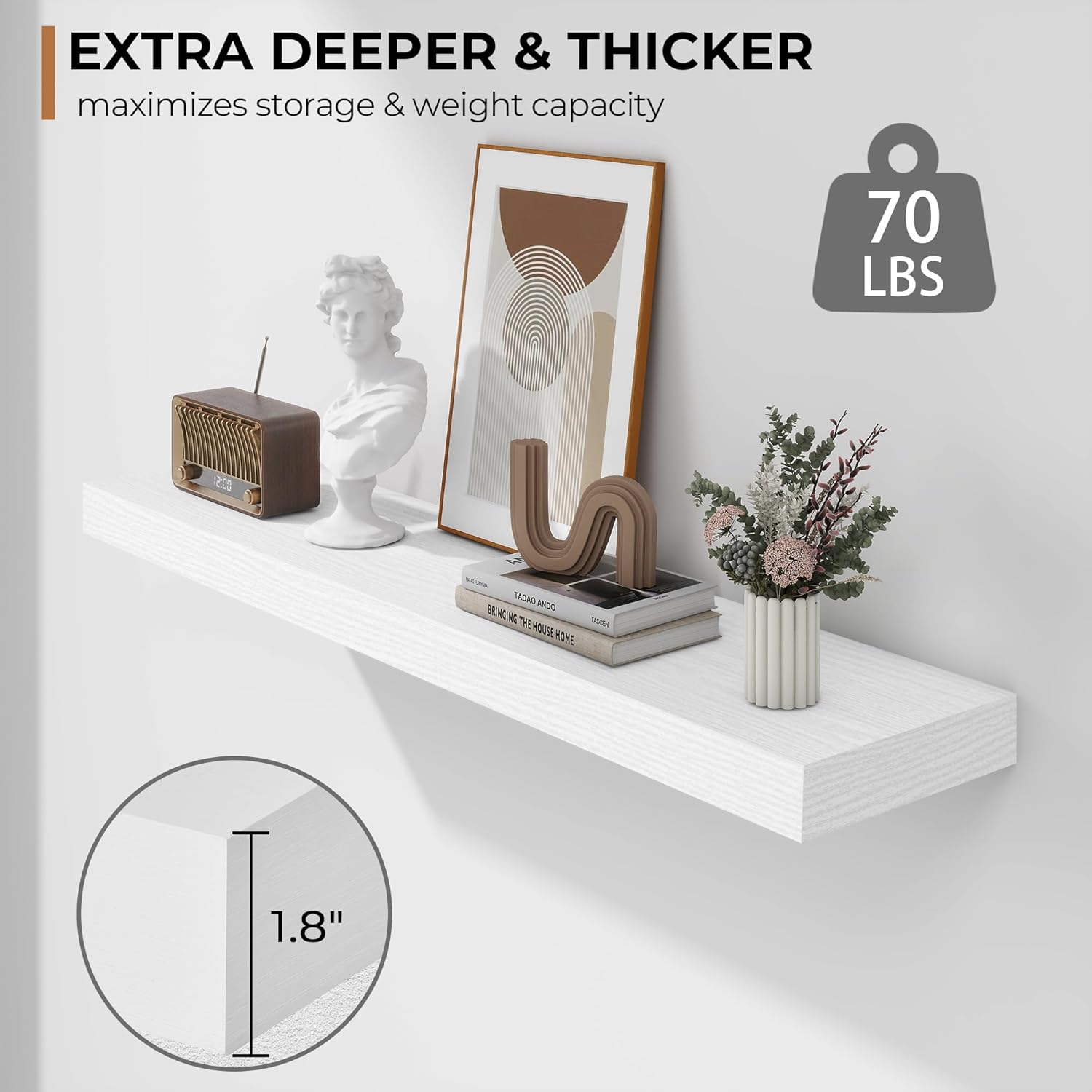 - Extra Deeper & Thicker - Each board measures 36"W x 8"D x 1.8"H. Extra deeper and thicker design in order to bring maximizes storage space and weight capacity, even hold up to 70 lb each. This floating shelf taking up zero square feet, reduces clutter and highlights décor in compact spaces.