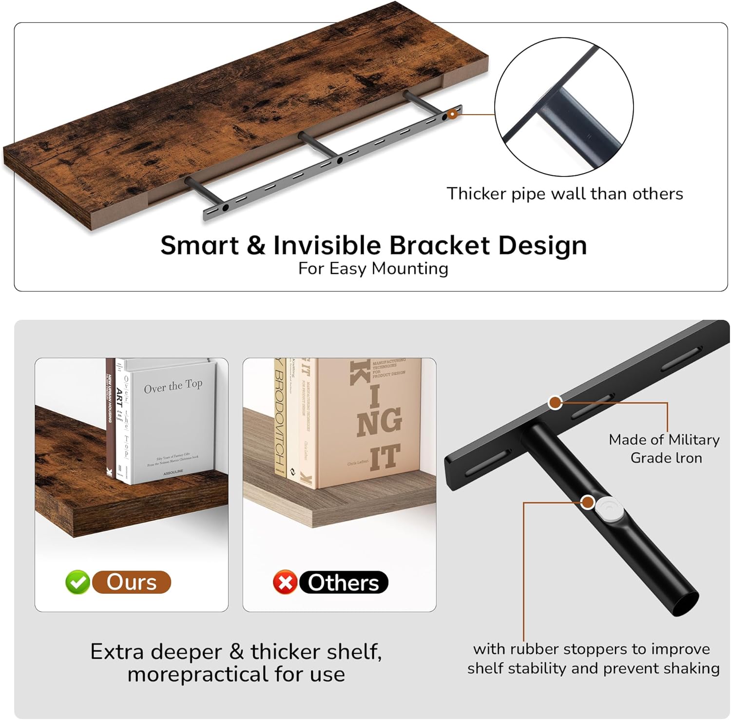 - Extra Deeper & Thicker - Each board measures 48"W x 12"D x 1.8"H. Extra deeper and thicker design in order to bring maximizes storage space and weight capacity, even hold up to 75 lb each. This floating shelf taking up zero square feet, reduces clutter and highlights décor in compact spaces.