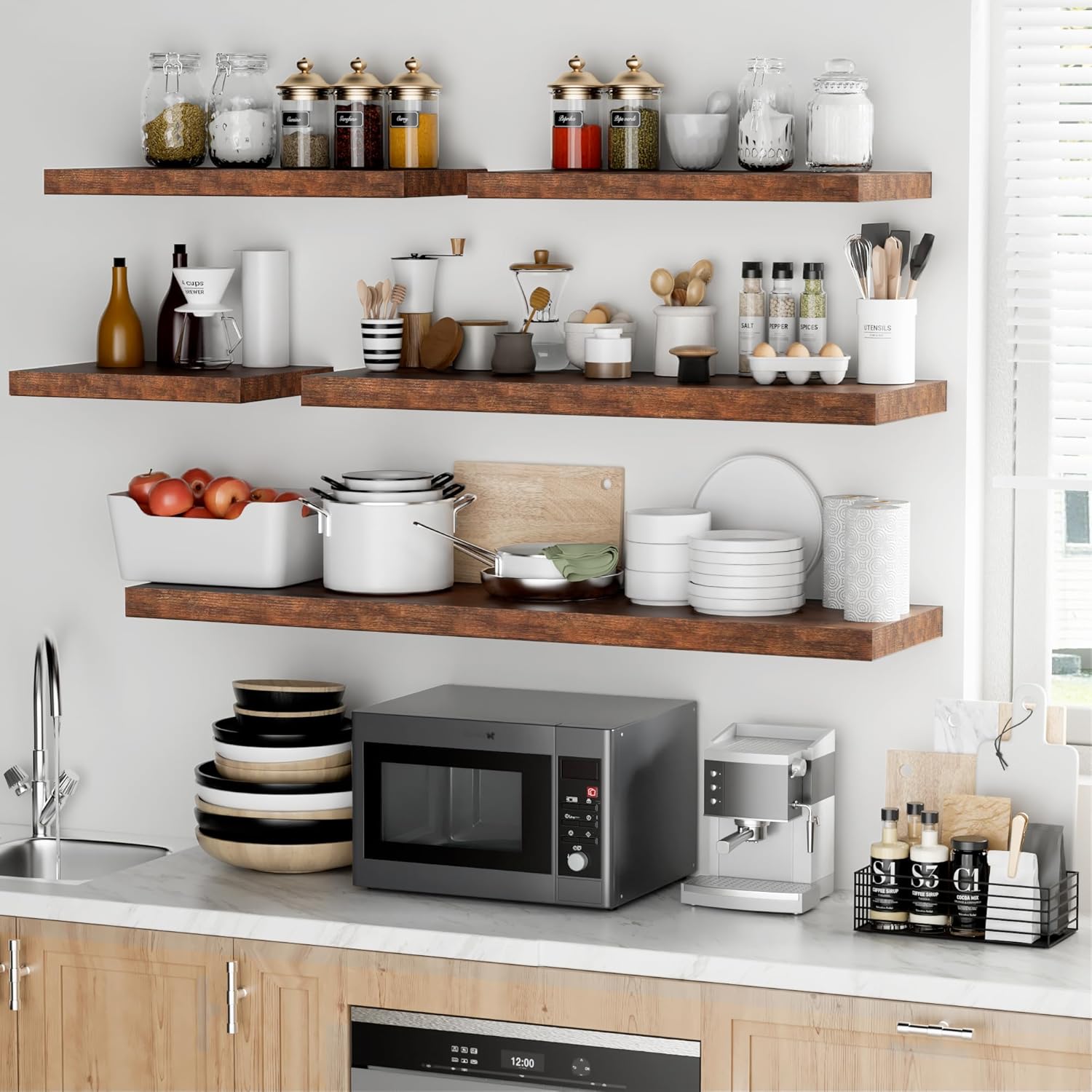 - Rustic & Modern Wooden Floating Shelves: Crafted from durable engineered wood with a realistic wood grain finish, our floating shelves offer the perfect blend of rustic charm and modern minimalism. The matte surface enhances its sleek, contemporary look, making it ideal for any room in your home. Whether you want to display your collection or organize essentials, these wall shelves seamlessly integrate with any décor and can be mounted on any wall to elevate your living space.