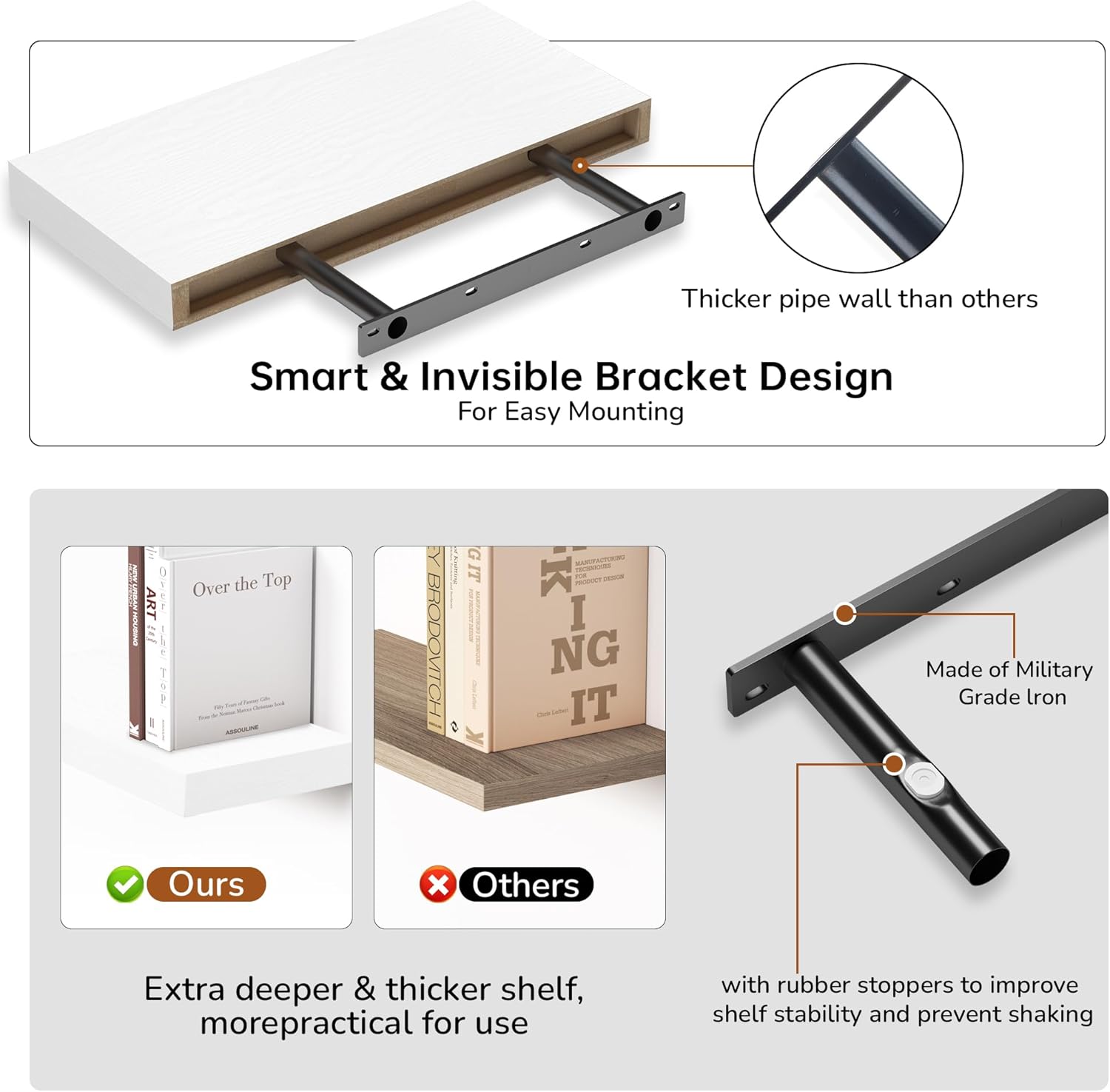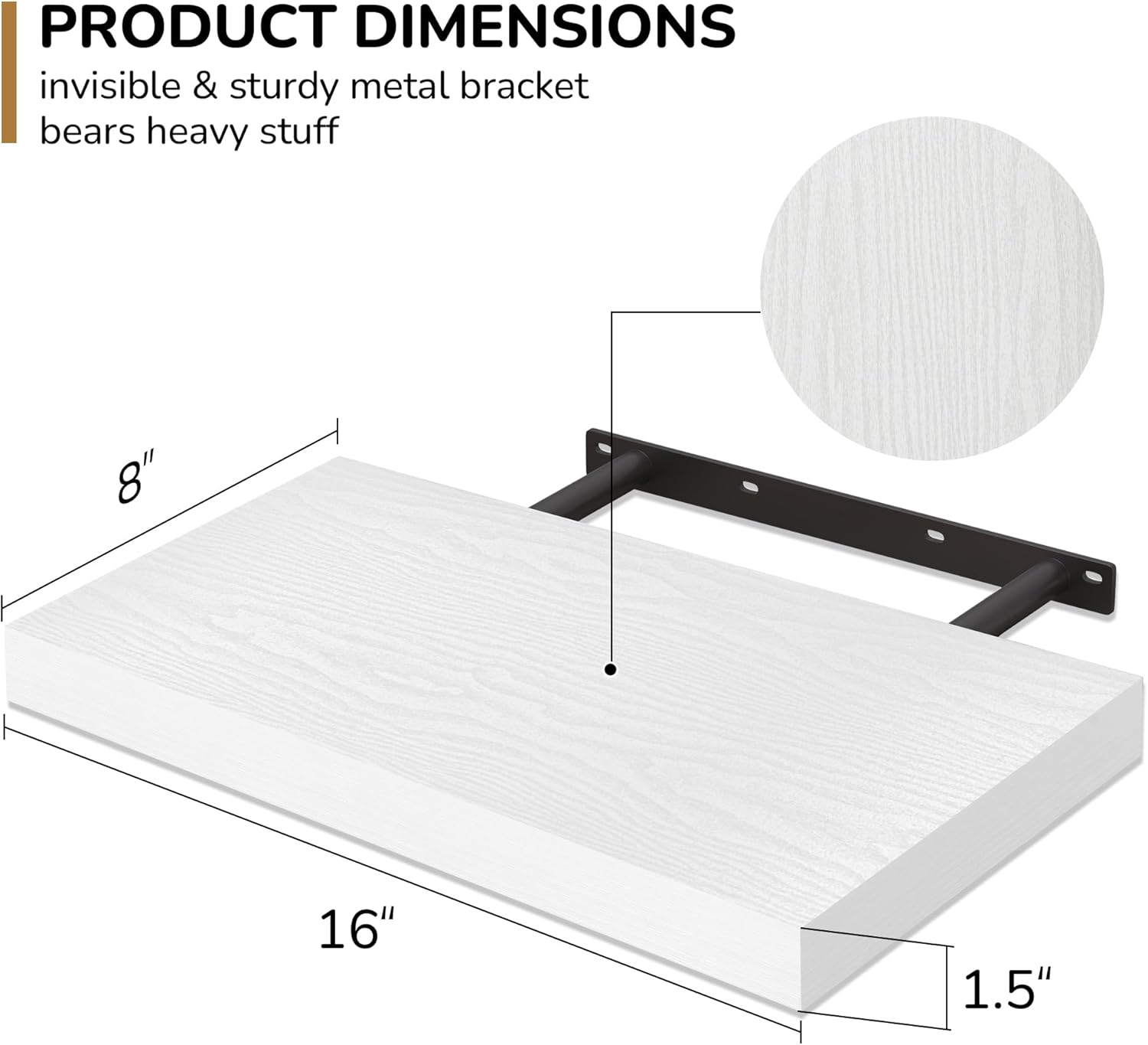 - Extra Deeper & Thicker - Each board measures 16"W x 8"D x 1.5"H. Extra deeper and thicker design in order to bring maximizes storage space and weight capacity, even hold up to 30 lb each. This floating shelf taking up zero square feet, reduces clutter and highlights décor in compact spaces.